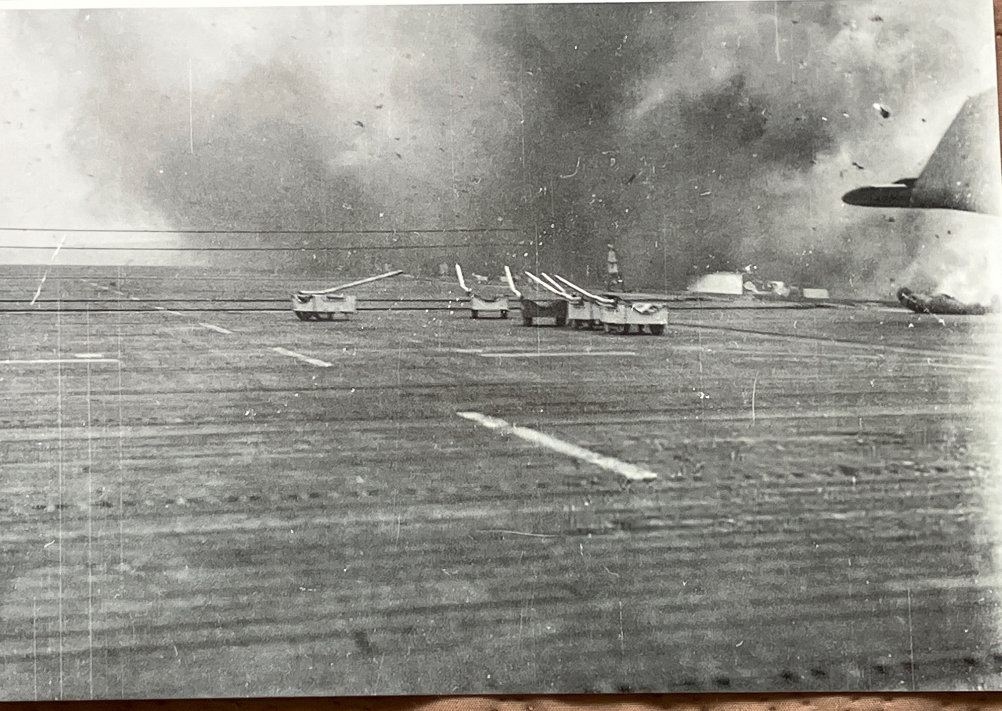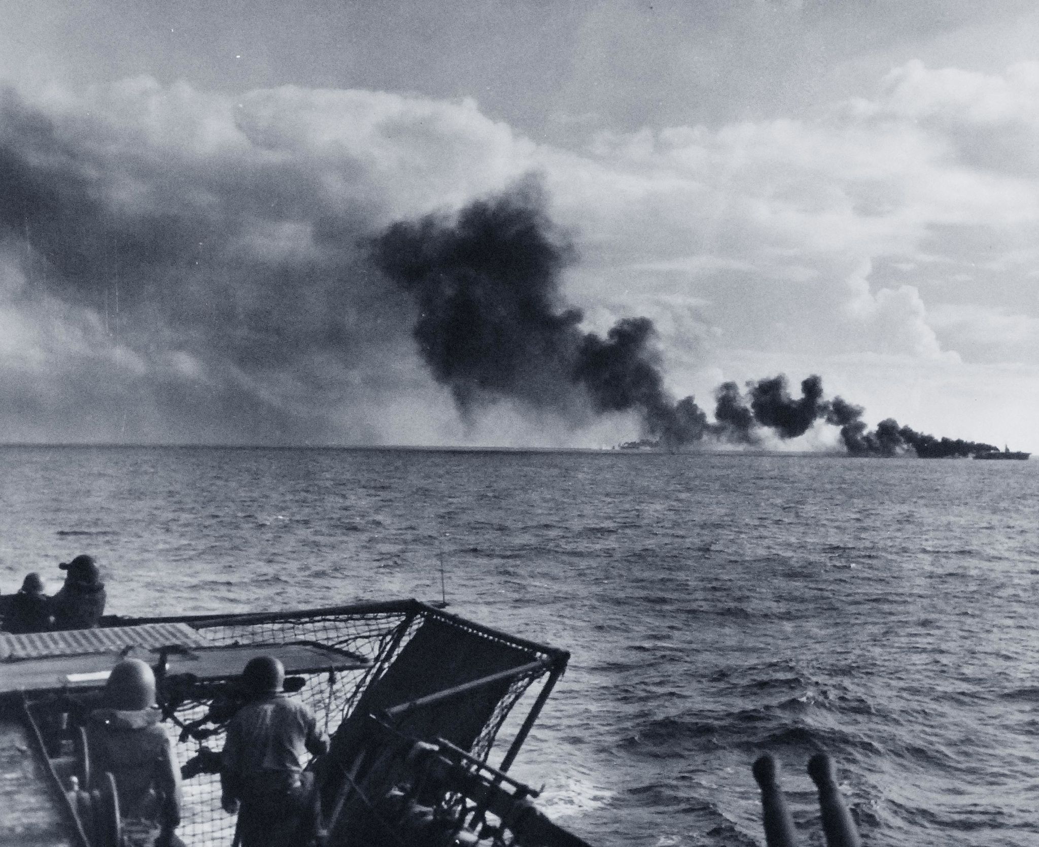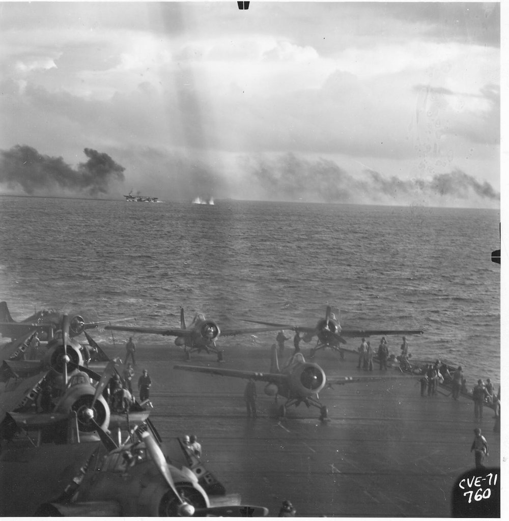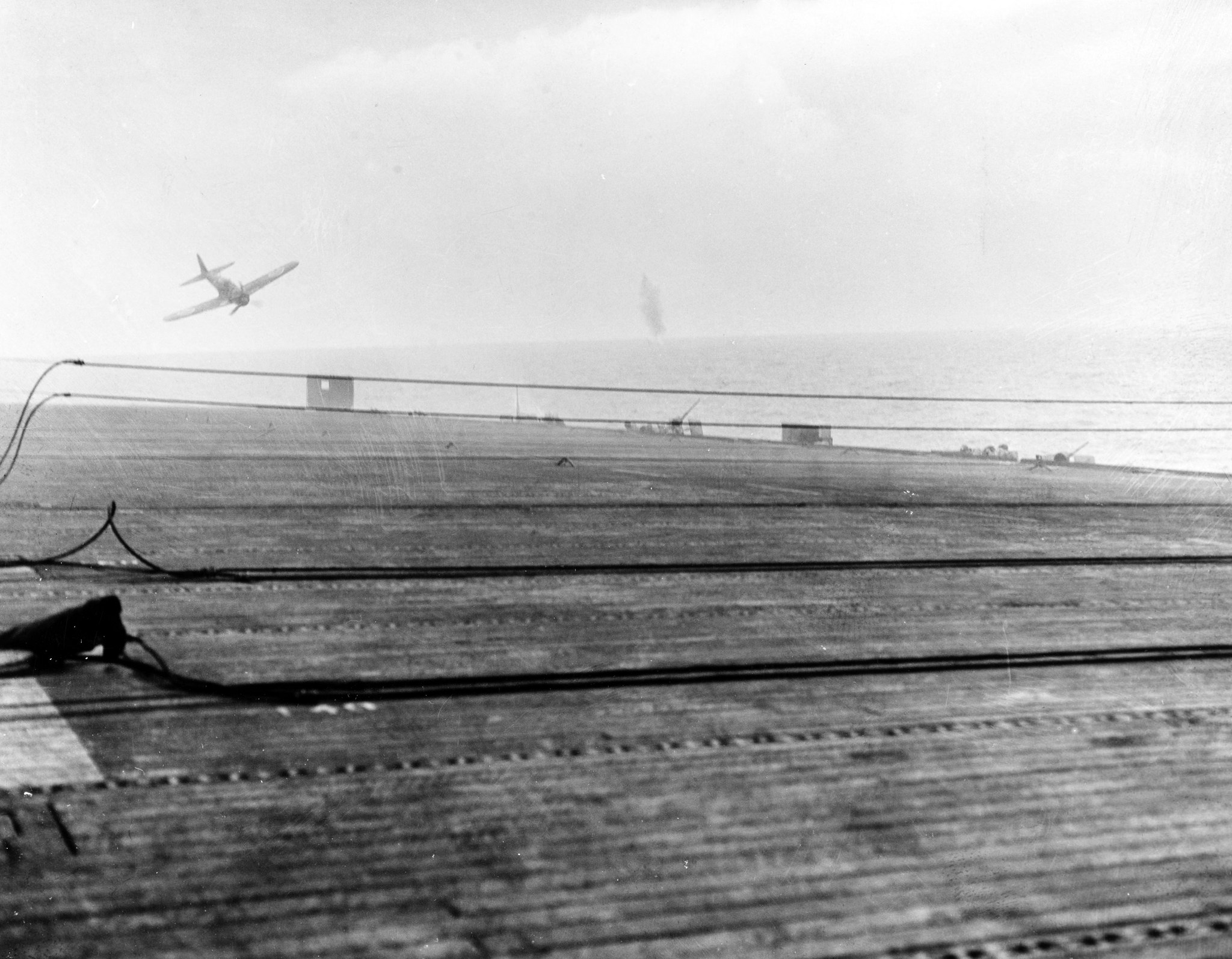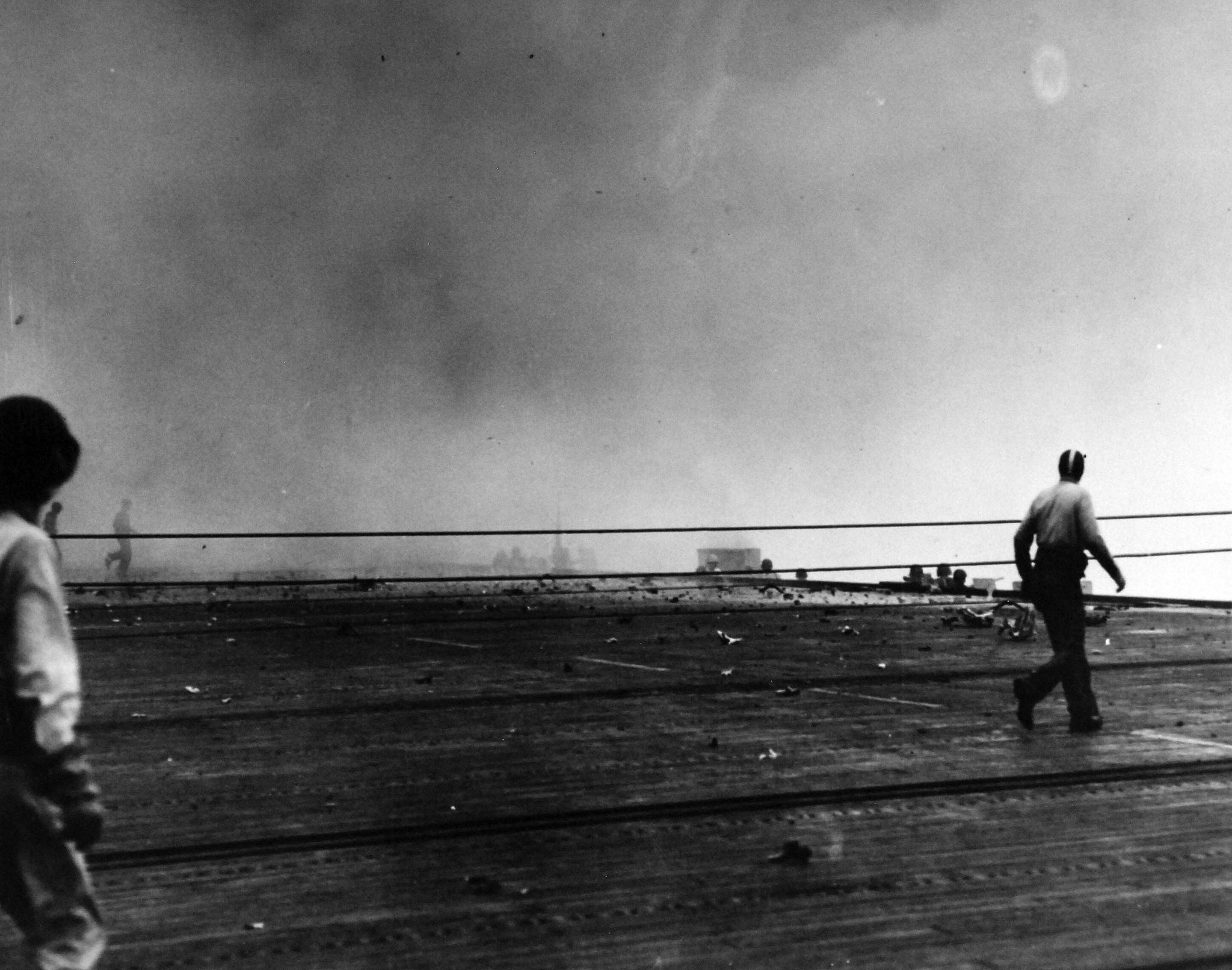 400k | Battle of Leyte Gulf, 24–26 October 1944. USS White Plains (CVE-66) after suicide dive by Japanese Zeke. Smoke from explosion still present, 25 October 1944. Sailor to the right is the same "yellow shirt" seen in NS0306606b. National Archives and Records Administration (NARA), photo # 80-G-384159. |