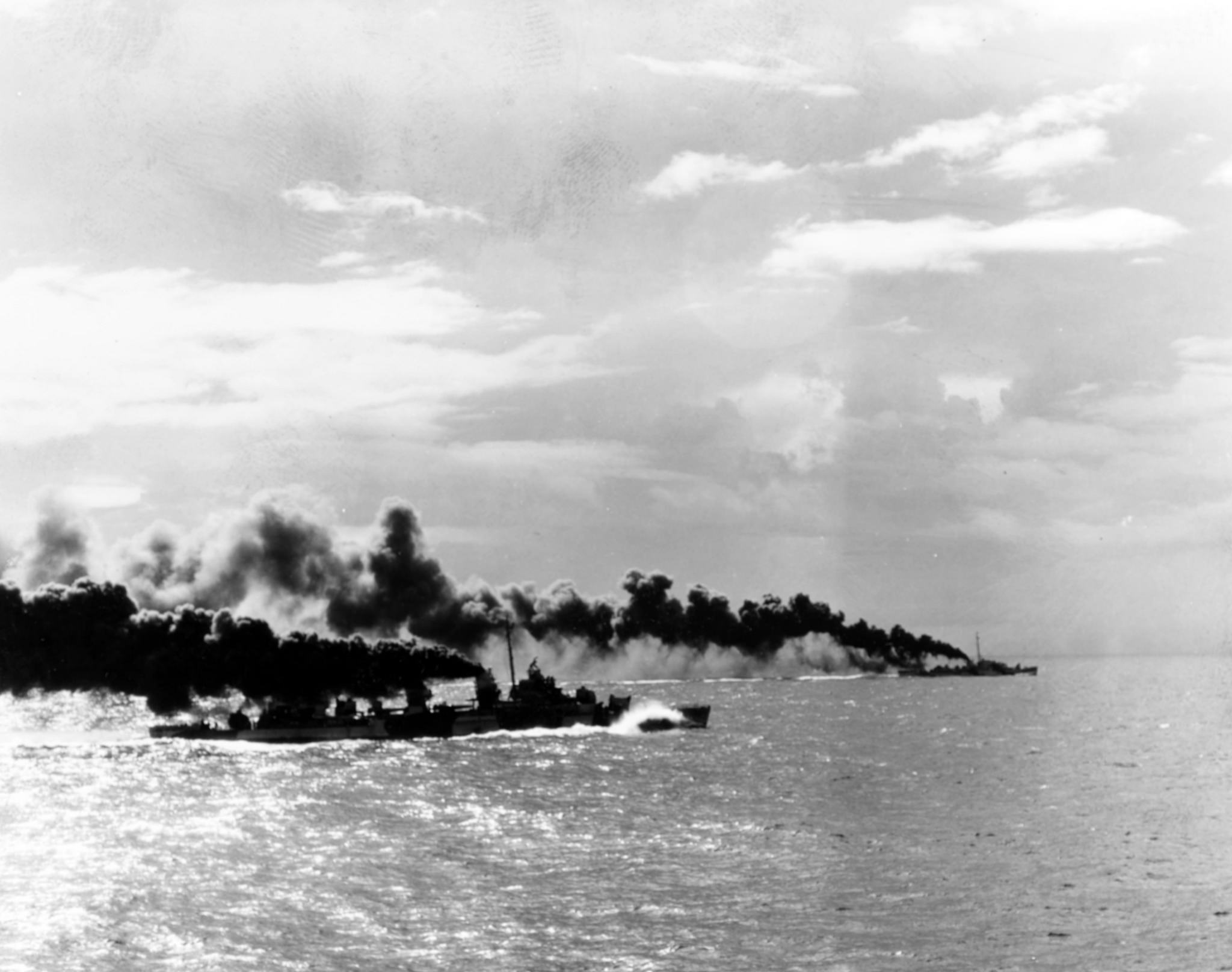 221k | Battle of Leyte Gulf, Battle off Samar, 25 October 1944. USS Heermann (DD-532), closer to camera, camouflaged in Ms.32, 24D, and a John C. Butler-escort—possibly John C. Butler (DE-339) herself, as she appears to be painted in Ms.32, Design 11D—lay a smoke screen to protect their escort carrier group from attacking Japanese surface ships. Photographed from USS White Plains (CVE-66). Official U.S. Navy Photograph, now in the collections of the National Archives and Records Administration (NARA), #80-G-288885. |
