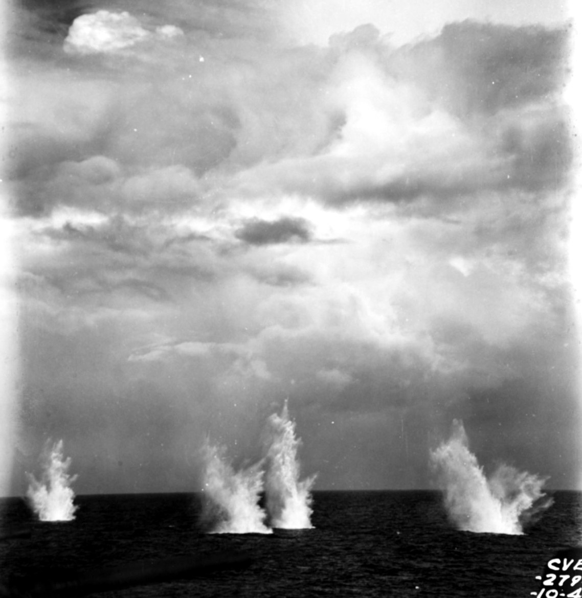 274k | Battle of Leyte Gulf, Battle off Samar, 25 October 1944. Splashes from Japanese shells near USS White Plains (CVE-66) during the Japanese fleet's attack on Carrier Division 25. Official U.S. Navy Photograph, now in the collections of the National Archives and Records Administration (NARA), #80-G-288886. |
