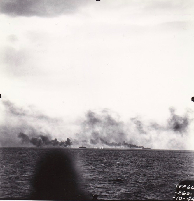 595k | Battle of Leyte Gulf, 24–26 October 1944. A CVE, possibly USS Gambier Bay (CVE-73), attacked by Japanese surface units, as seen from USS White Plains (CVE-66). National Archives and Records Administration (NARA) photo, # 80-G-384160. |