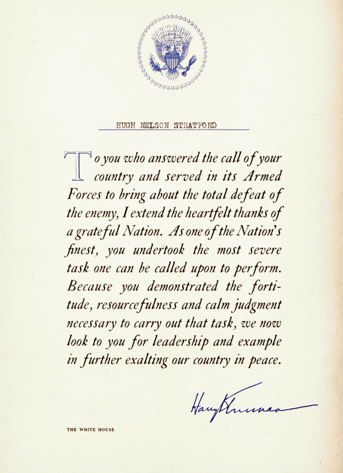 332k | Letter from President Truman, sent to all who served and survived. | Hugh Stratford, USS White Plains | |