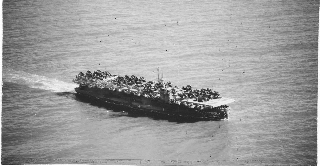 258k | USS White Plains (CVE-66) transporting aircraft, off the California coast, circa the first half of 1945. |