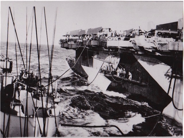107k | USS White Plains (CVE-66) refueling at sea, circa late 1944. |