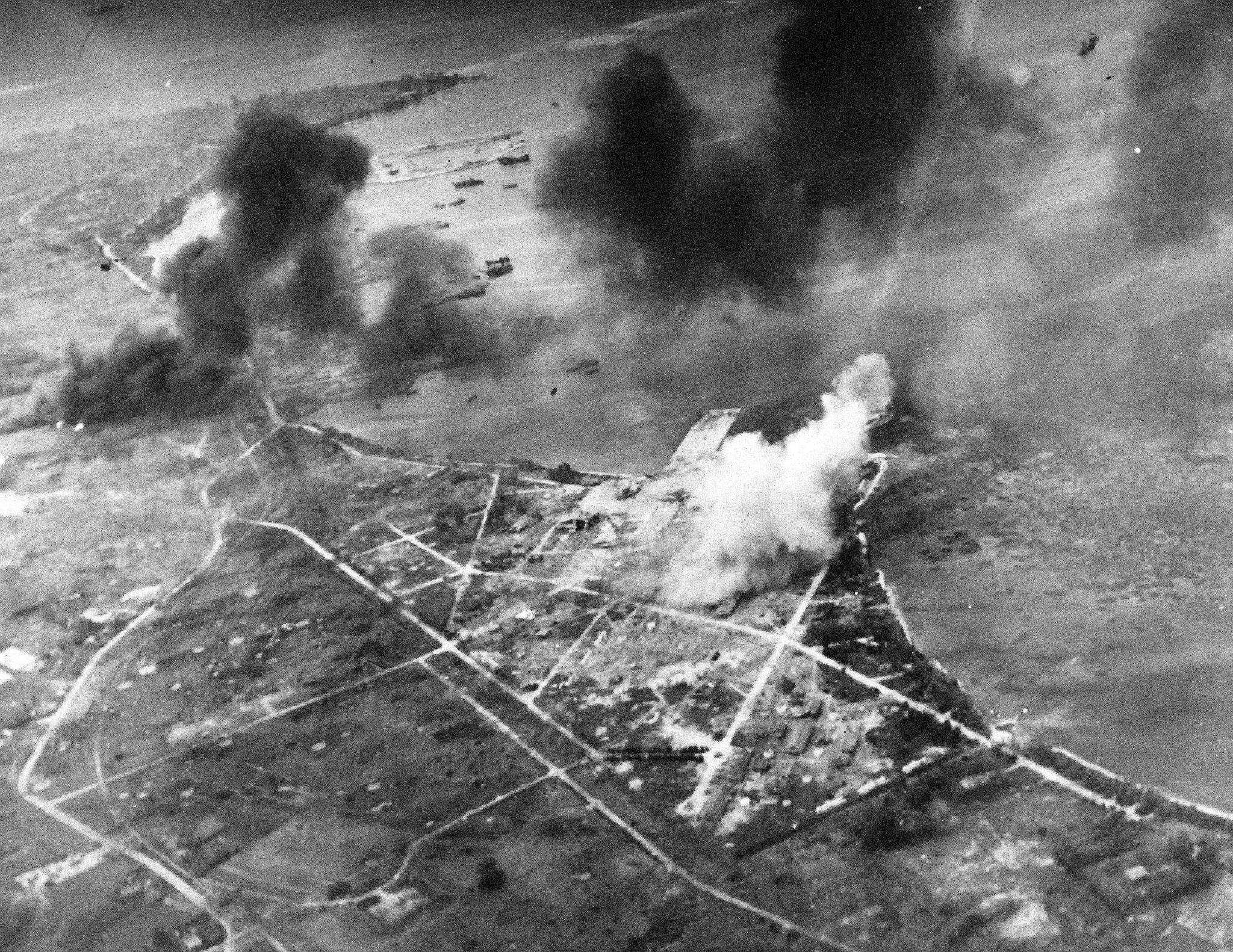 693k | Bombing of Tinian Island, taken by plane from USS White Plains (CVE-66), 25 July 1944. National Archives and Records Administration (NARA), # 80-G-384179. |