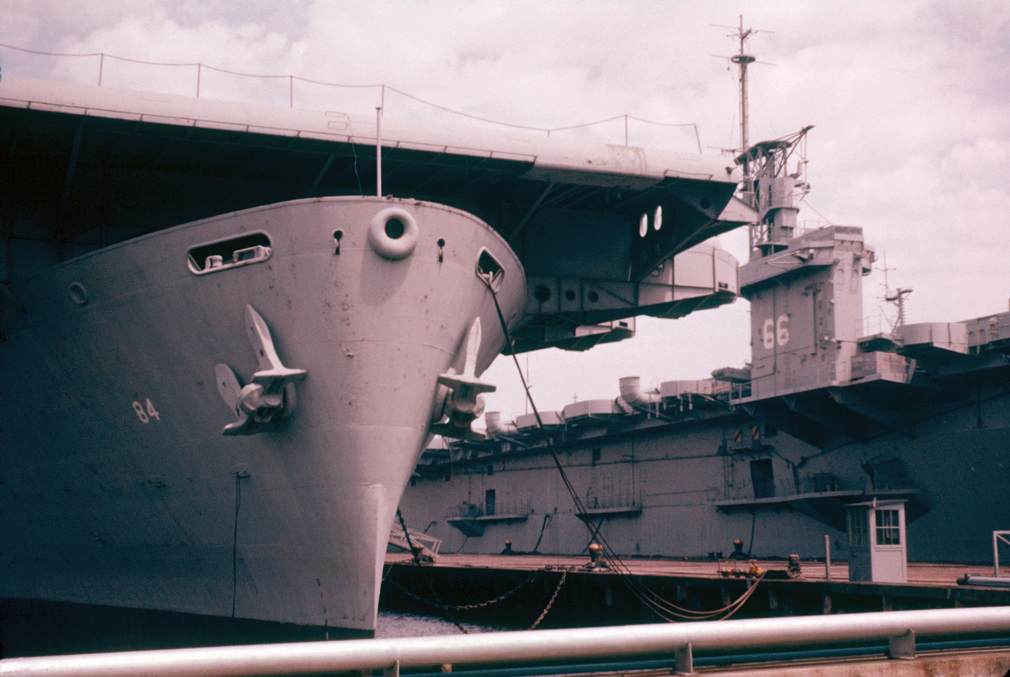 841k | USS White Plains (CVE-66), wearing Camouflage Measure 33, Design 10A, at San Diego, 27(?) November 1944, having arrived there earlier the same day. The ship was there for repair of damages received in the Battle off Samar a month earlier. The colors are navy blue, haze gray and pale gray. National Archives and Records Administration (NARA), photo # 80-G-272915. |