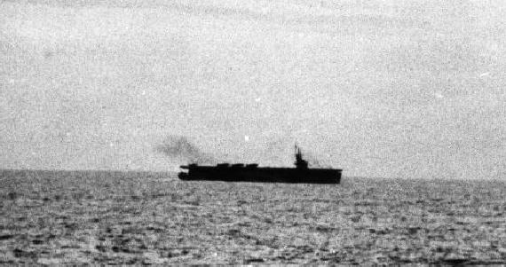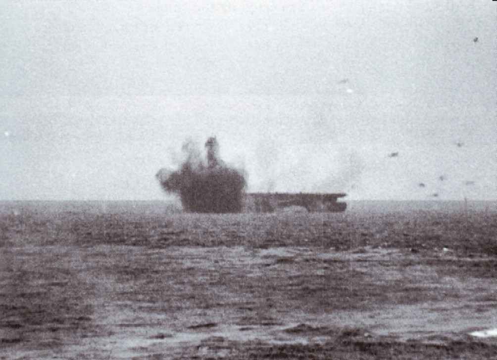305k | A Japanese plane crashes astern of USS Kitkun Bay (CVE-71) during an attack on Task Group 52.11, 18 June 1944, Marianas Operation. Seen from USS Gambier Bay (CVE-73). National Archives and Records Administration (NARA) photo, # 80-G-243432. |