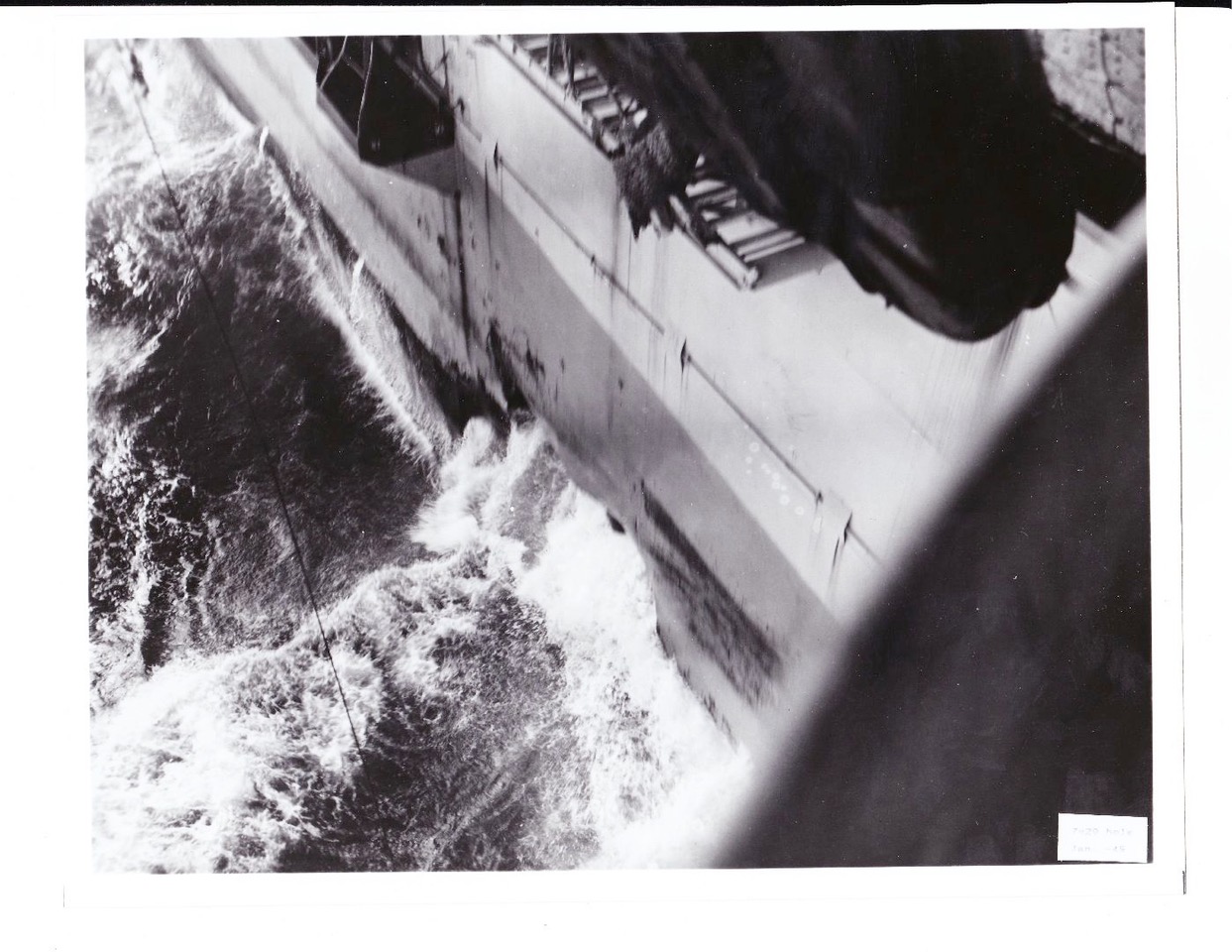 246k | "Damage to USS Kitkun Bay consisting of a hole approximately 20 feet long and 7 feet high, and 4 feet above the water line and 3 feet below the water line (between ship frames 113 and 121) caused by a successful attack by a Japanese Oscar kamikaze on January 8, 1945 in Lingayen Gulf, Philippine Islands." (Thanks to Daniel J. Bacastow. His father, Jack L. Bacastow, AOMc2, USNR, served aboard the ship during both kamikaze attacks—25 October 1944 and 8 January 1945—and has a personal collection of many U.S. Navy photos from both engagements.) |