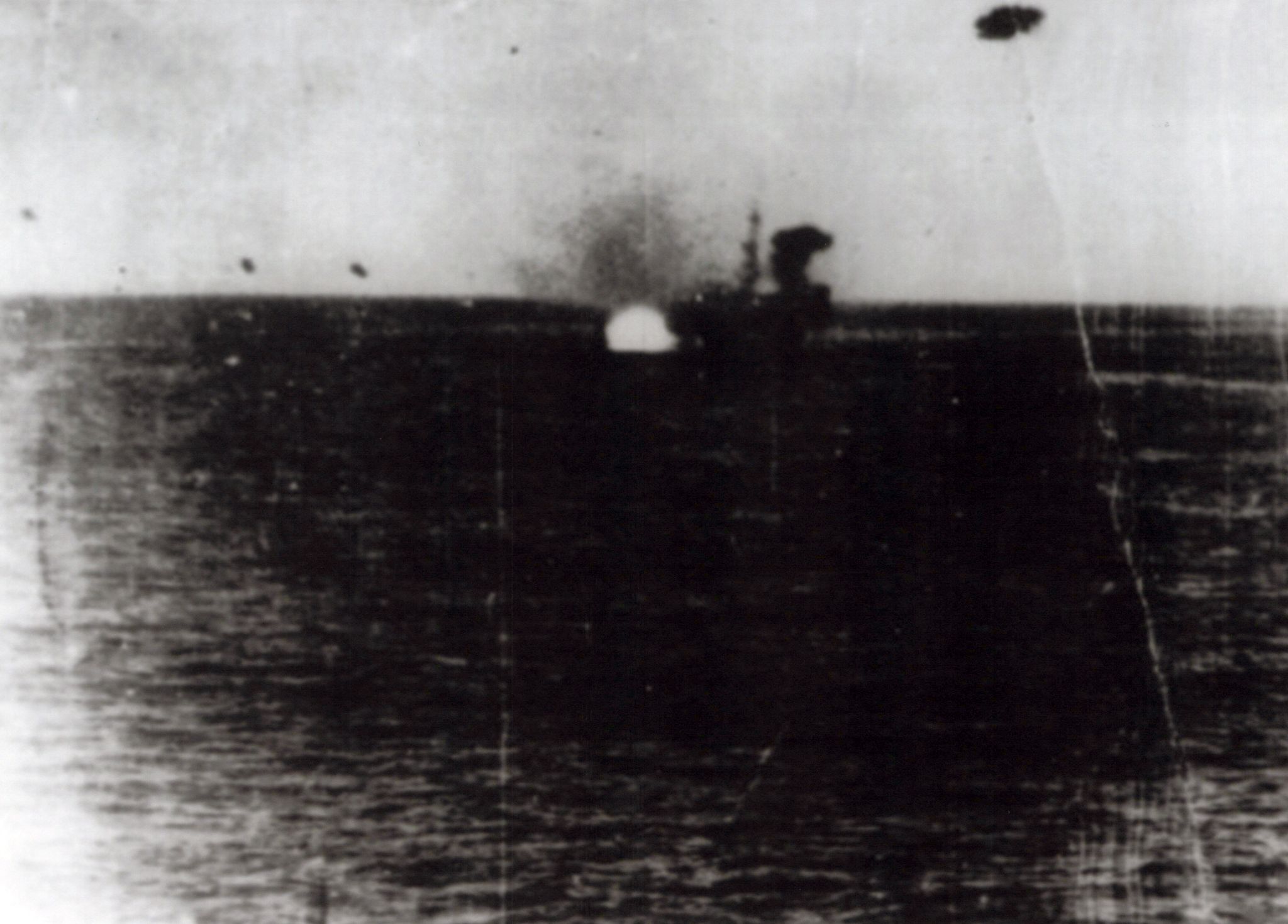 233k | A Japanese cruiser (on horizon), a unit of fleet moving on Philippines, shells a carrier-escort during the Battle of Leyte Gulf, 25 October 1944. As seen from USS Kitkun Bay (CVE-71). Shown as the salvo is put astern. National Archives and Records Administration (NARA) photo, # 80-G-287503. |