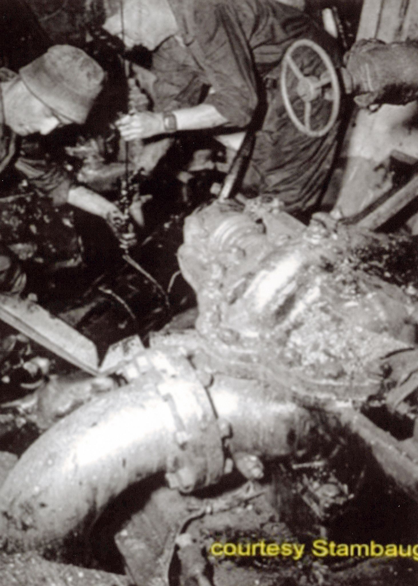 575k | USS Kitkun Bay (CVE-71) after a damaging suicide attack on the ship. Body of Japanese bomb is shown after having been removed from the boiler. Photograph released 20 January 1945. Official U.S. Navy photograph, now in the collections of the National Archives and Records Administration (NARA), # 80-G-273160. |