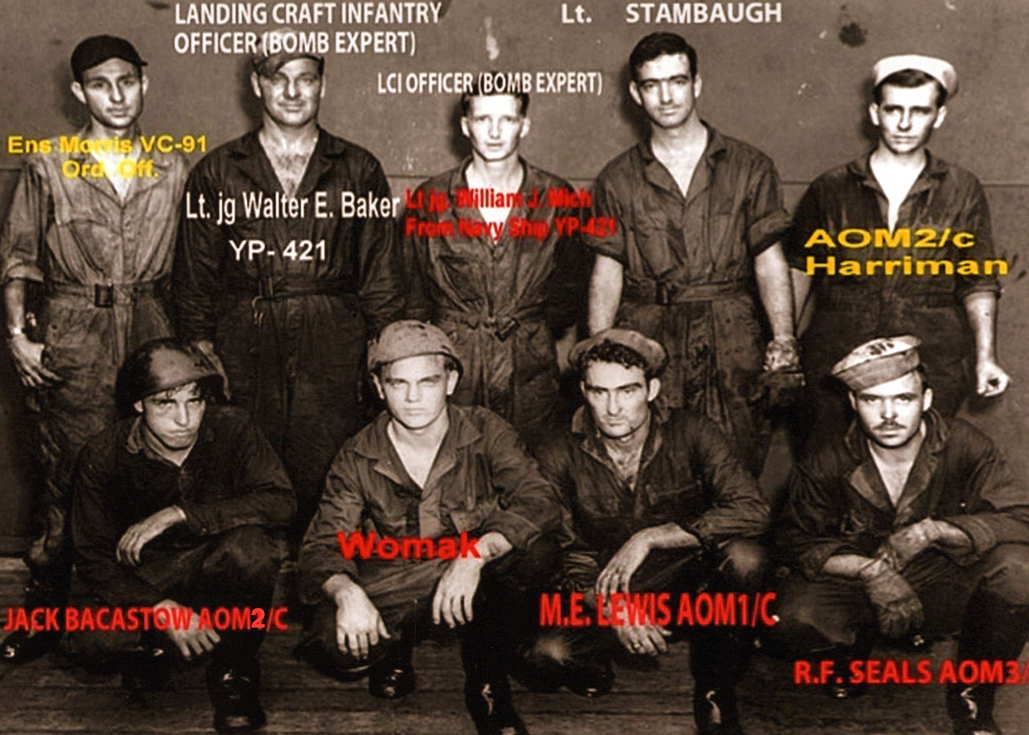 444k | Bomb Disposal Crew, Machine Shop. unexploded Japanese ordnance, USS Kitkun Bay (CVE-71), Kamikaze attack, January 1945. |