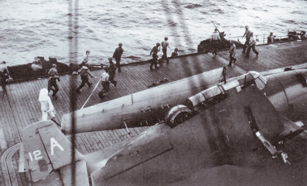 240k | "Underdog U.S. Escort Carrier Group Fights Off Superior Jap Force: Standing up courageously to the overwhelming might of a vastly superior Jap fleet which steamed out of San Bernardino Strait in the morning mist of 10/25/1944, ships of an escort carrier group of the 7th Fleet grimly fought off the foe until the latter broke off the action. The clash was 'Round Three' of the 2nd Battle of the Philippine Sea. Scene on the deck of the escort carrier USS Kitkun Bay as planes are spotted on the broad wooden expanse." BuAer 287524; U.S. Navy BUMED Library and Archives. |