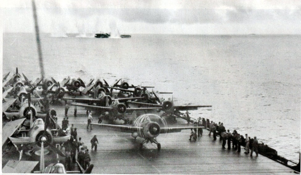 179k | FM Wildcats begin their launch from the escort aircraft carrier USS Kitkun Bay (CVE-71), the only means the escort carriers had to defend themselves. TBM Avengers line the flight deck to starboard, bomb doors open, awaiting ordnance. In the background the escort carrier USS White Plains (CVE-66) dodges shell splashes from a Japanese cruiser visible as a smudge on the horizon, 25 October 1944. Photo from NARA (National Archives and Records Administration), College Park, MD. |