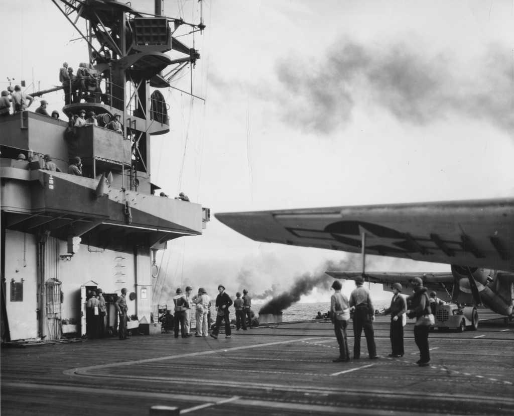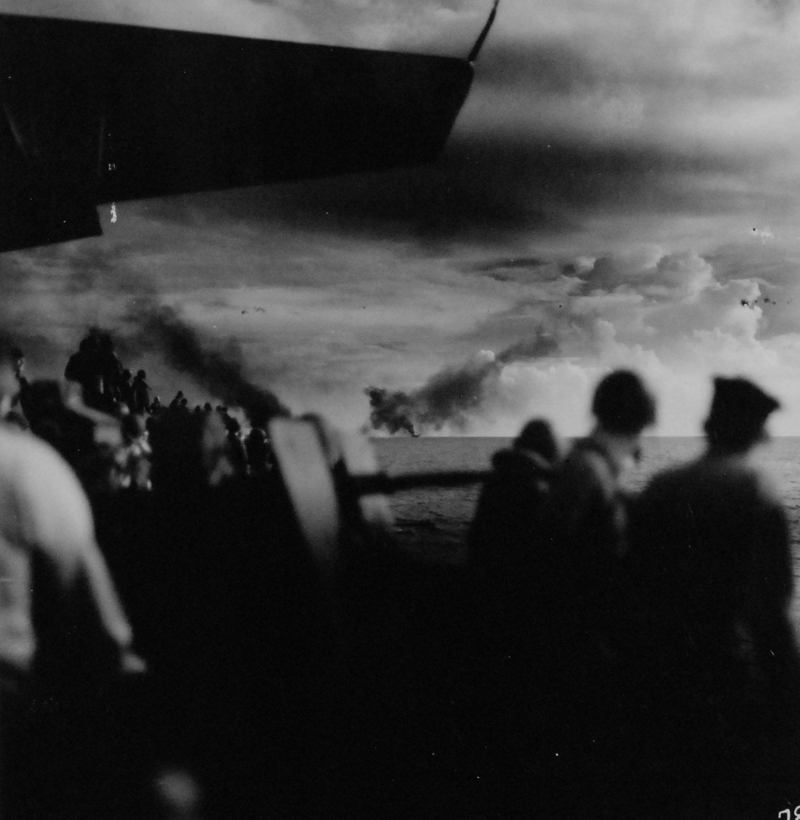 203k | Salvos from ships of Japanese fleet moving toward Philippines fall wide of mark on escort carrier during Battle of Leyte Gulf, 25 October 1944. As seen from USS Kitkun Bay (CVE-71) while the crew watches. National Archives and Records Administration (NARA) photo, # 80-G-287512. |