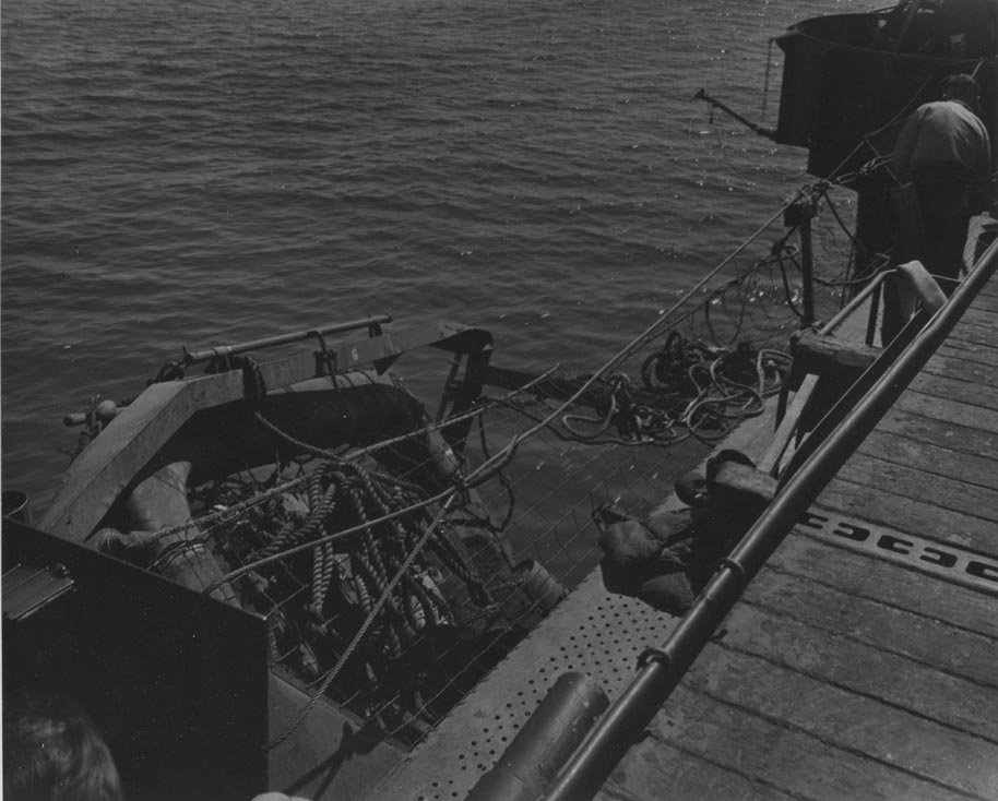 545k | This photo shows the temporary railing that was welded in place (see above). National Archives photo (# 80-G-289812). |
