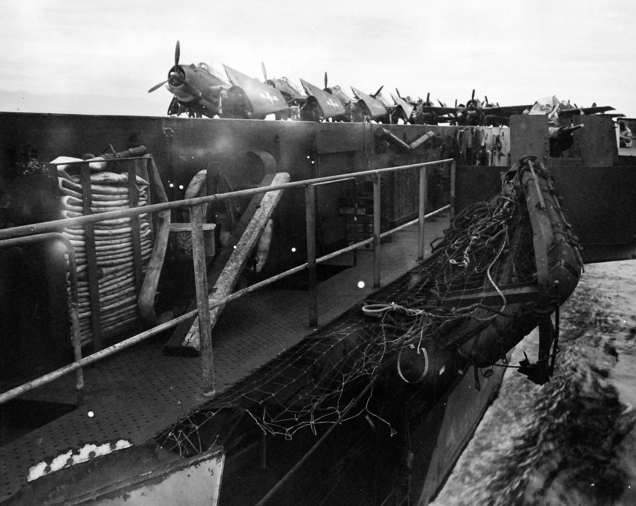 300k | USS Kitkun Bay (CVE-71) launches Avengers to engage Japanese fleet during the Battle of Leyte Gulf, 25 October 1944. National Archives and Records Administration (NARA) photo, # 80-G-287426. |