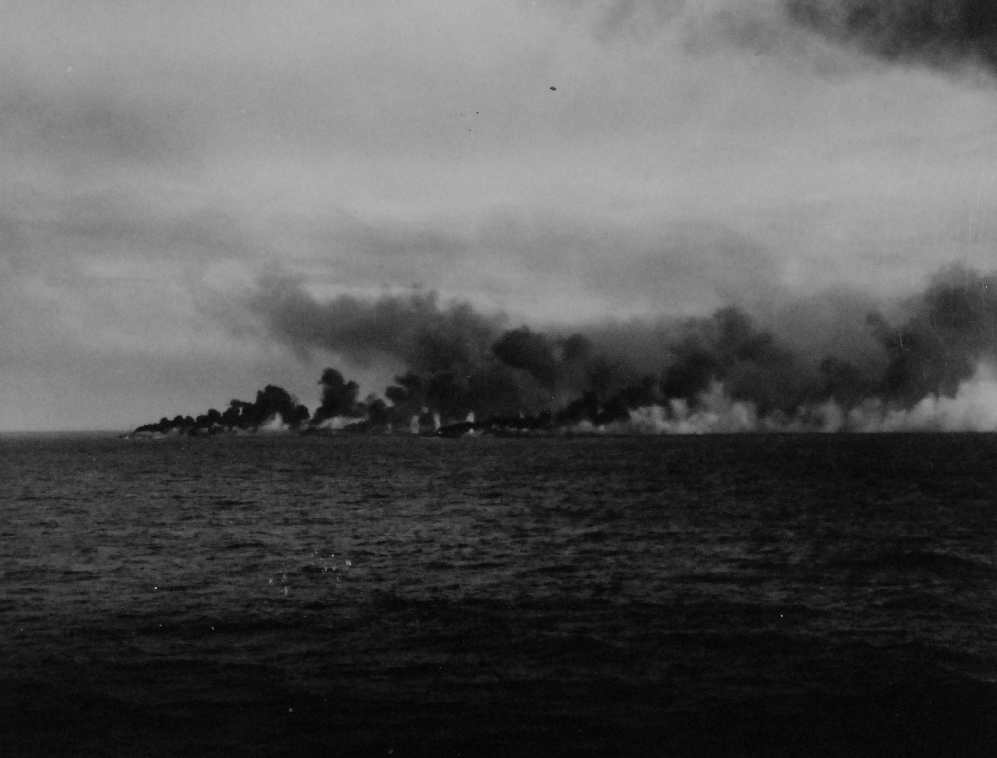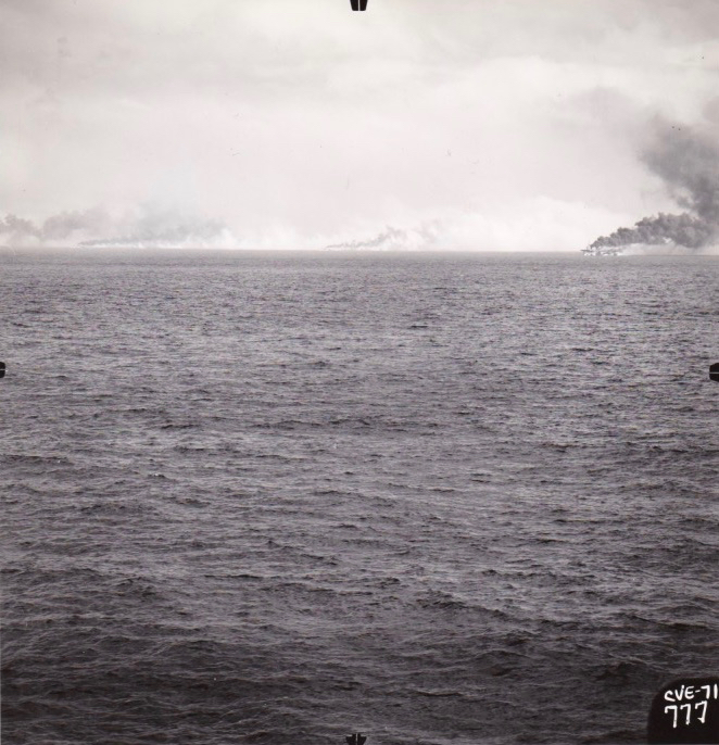241k | Allied fleet is attacked by Japanese off Leyte in the Philippines, 25 October 1944. Black smoke rising from funnels of CVEs. Seen from USS Kitkun Bay (CVE-71). DDs and DEs lay smoke while being shelled by Japanese fleet. National Archives and Records Administration (NARA) photo, # 80-G-47038. |