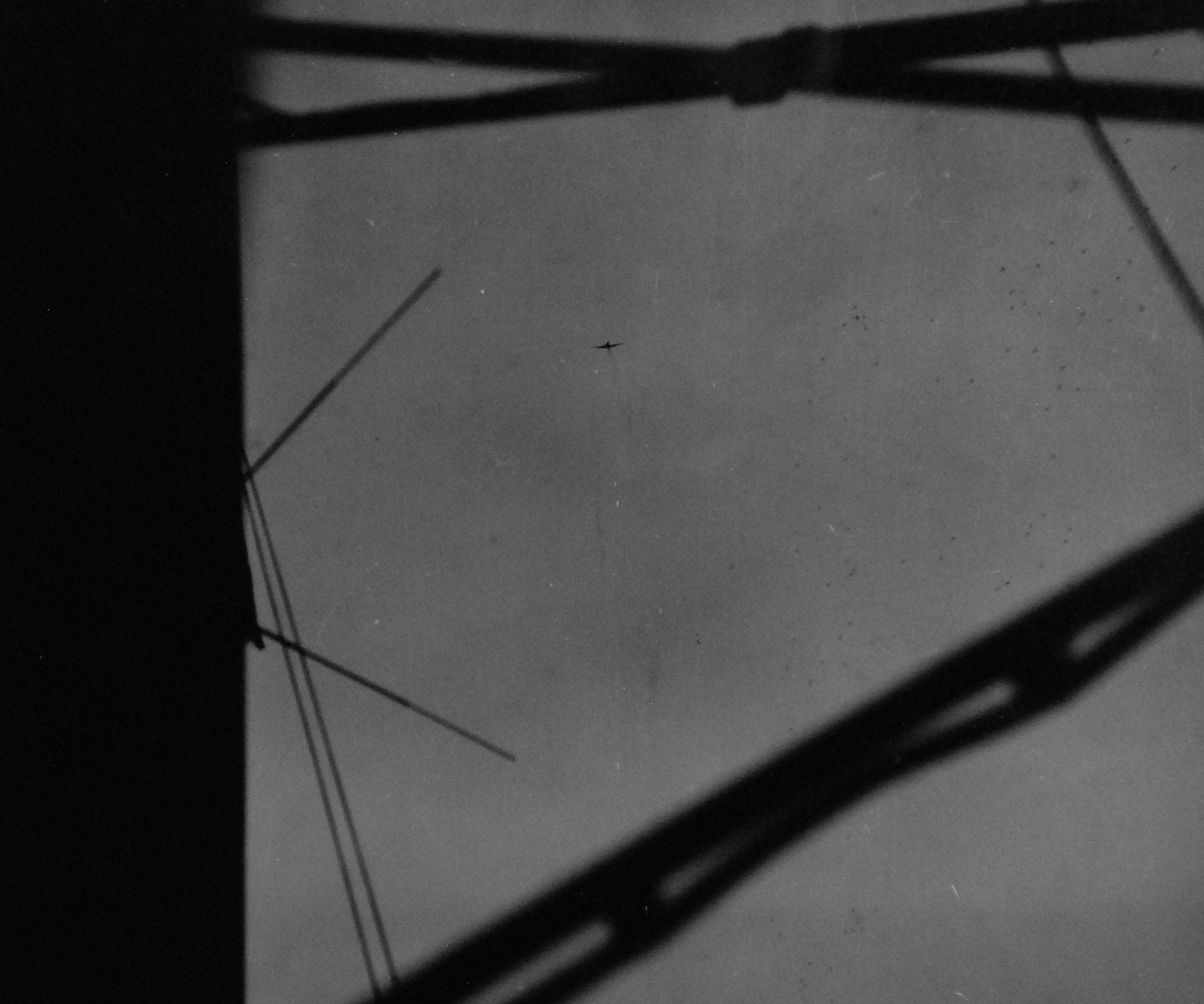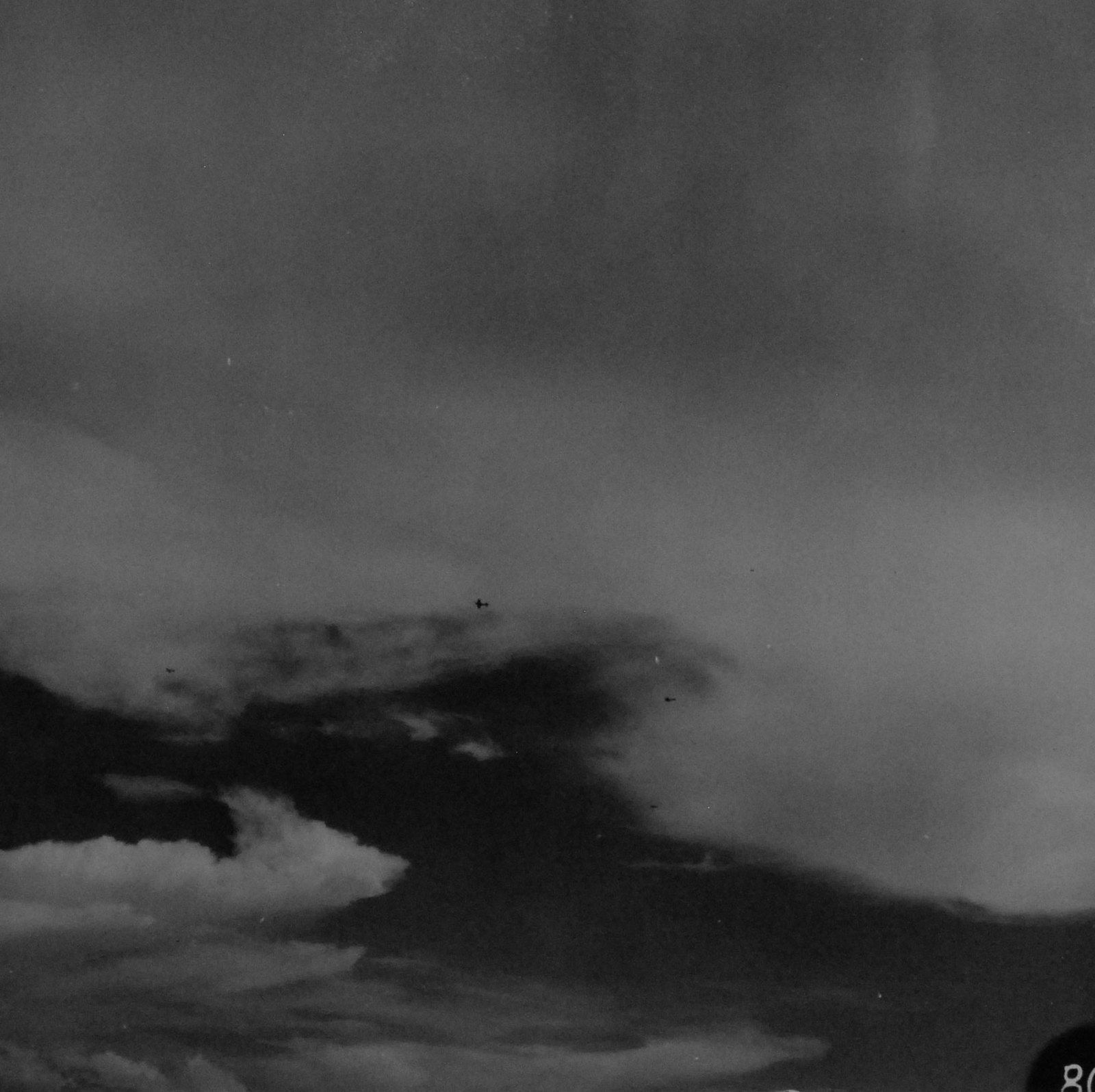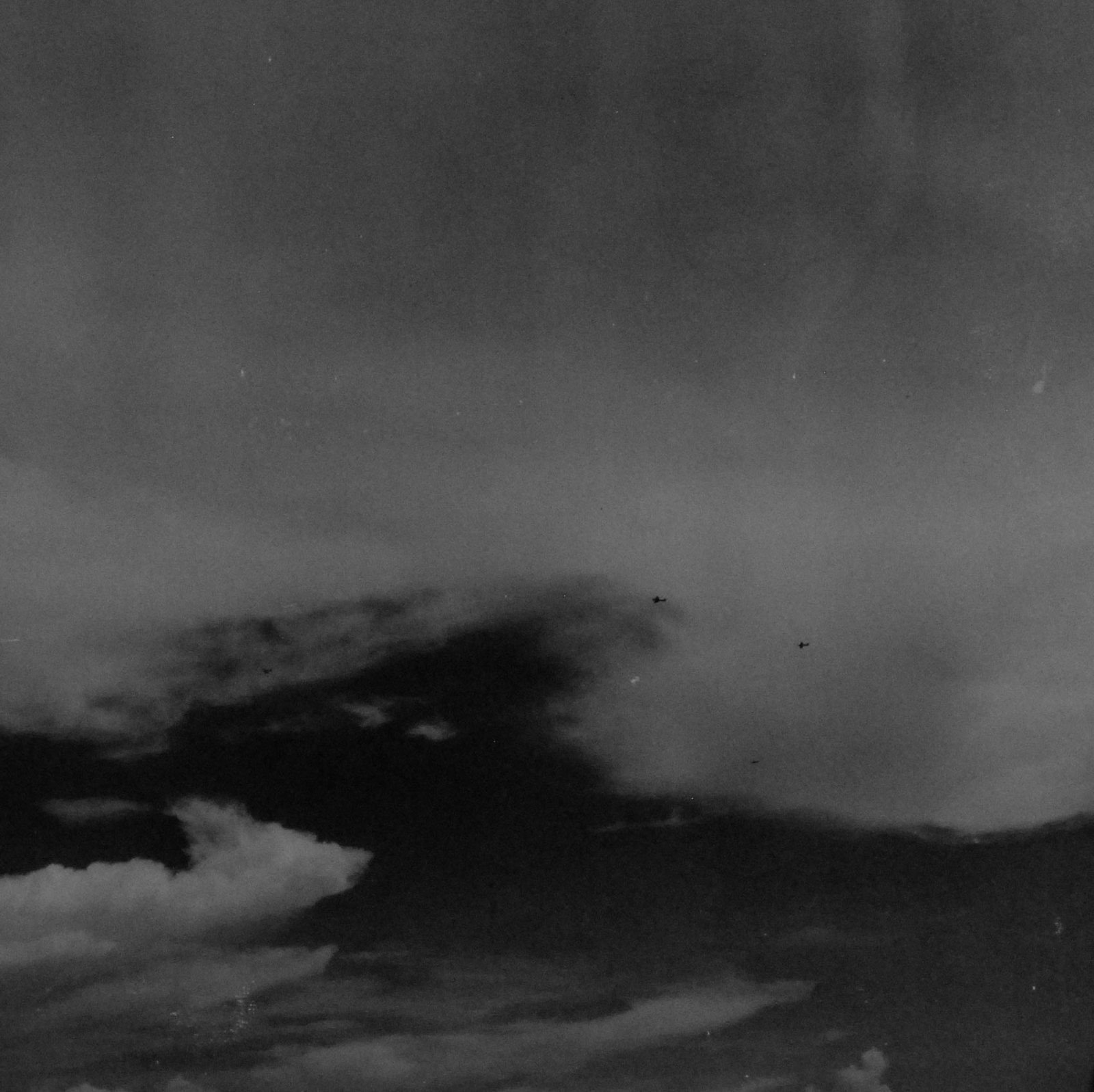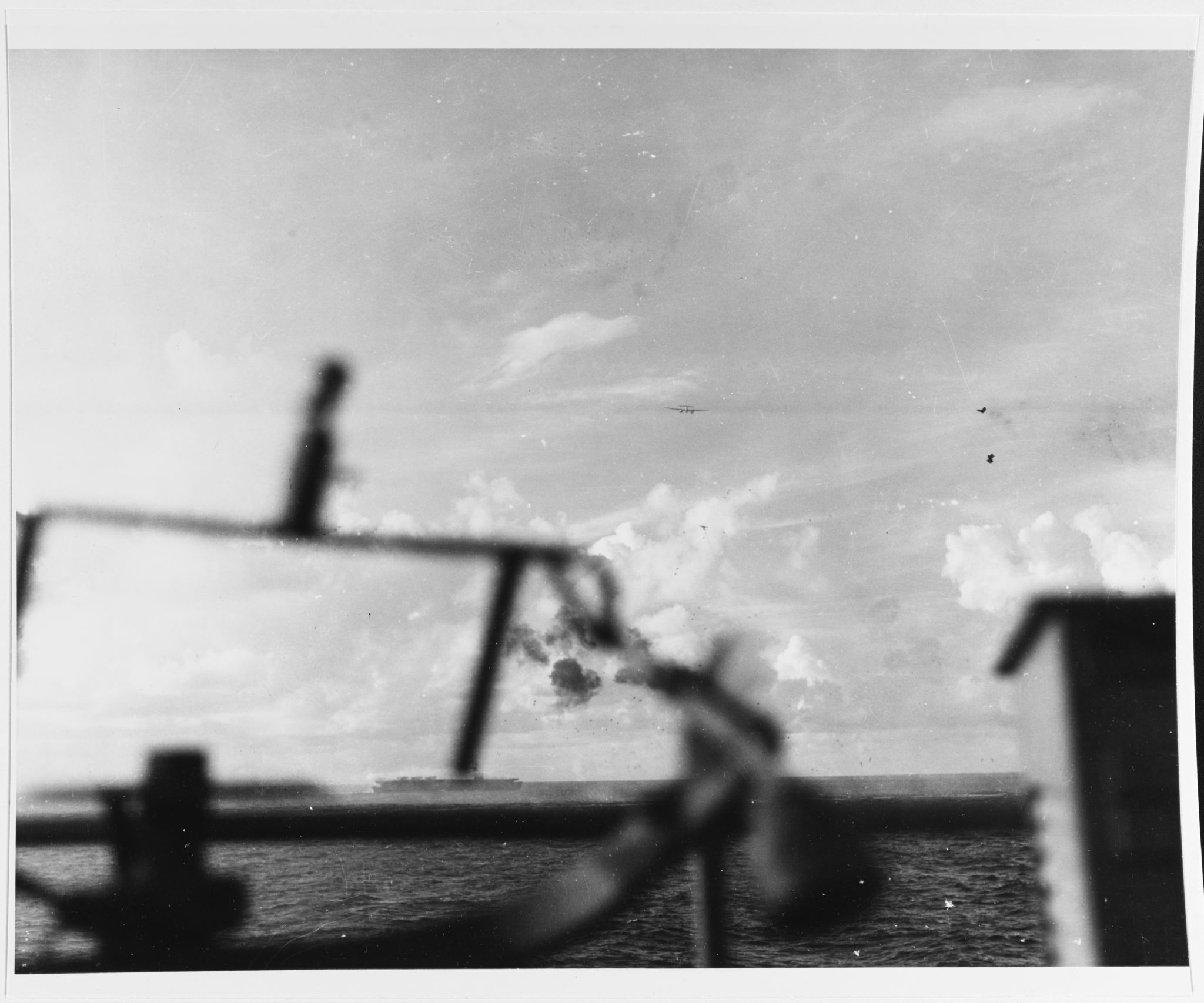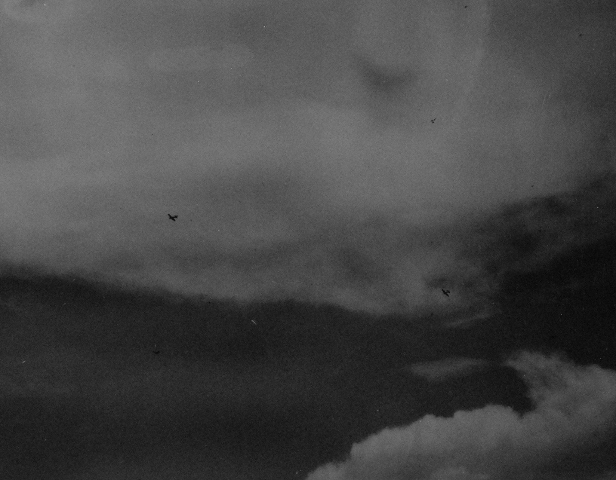 301k | Japanese aircraft group ready to make suicide dive on USS St. Lo (CVE-63) and USS Kitkun Bay (CVE-71) during Battle of Leyte Gulf, 25 October 1944. Photographed from abeam of CVE. National Archives and Records Administration (NARA) photo, # 80-G-287431. |
