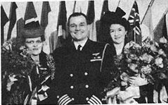 14k | "Mrs. Edgar A. Cruise, wife of CAPT Cruise of the Seattle Naval Air Station, christened the USS Kitkun Bay, on November 8. Mrs. Viola Cruise, left, mother of CAPT Cruise, was matron of honor. The captain suggested during launching ceremonies, 'Your slogan now is '18 or more by '44.' I'd like to add 'Double the score in '44'." (From "Bo's'n's Whistle," Vol. 3, No. 22; November 25, 1943; page 7.) |