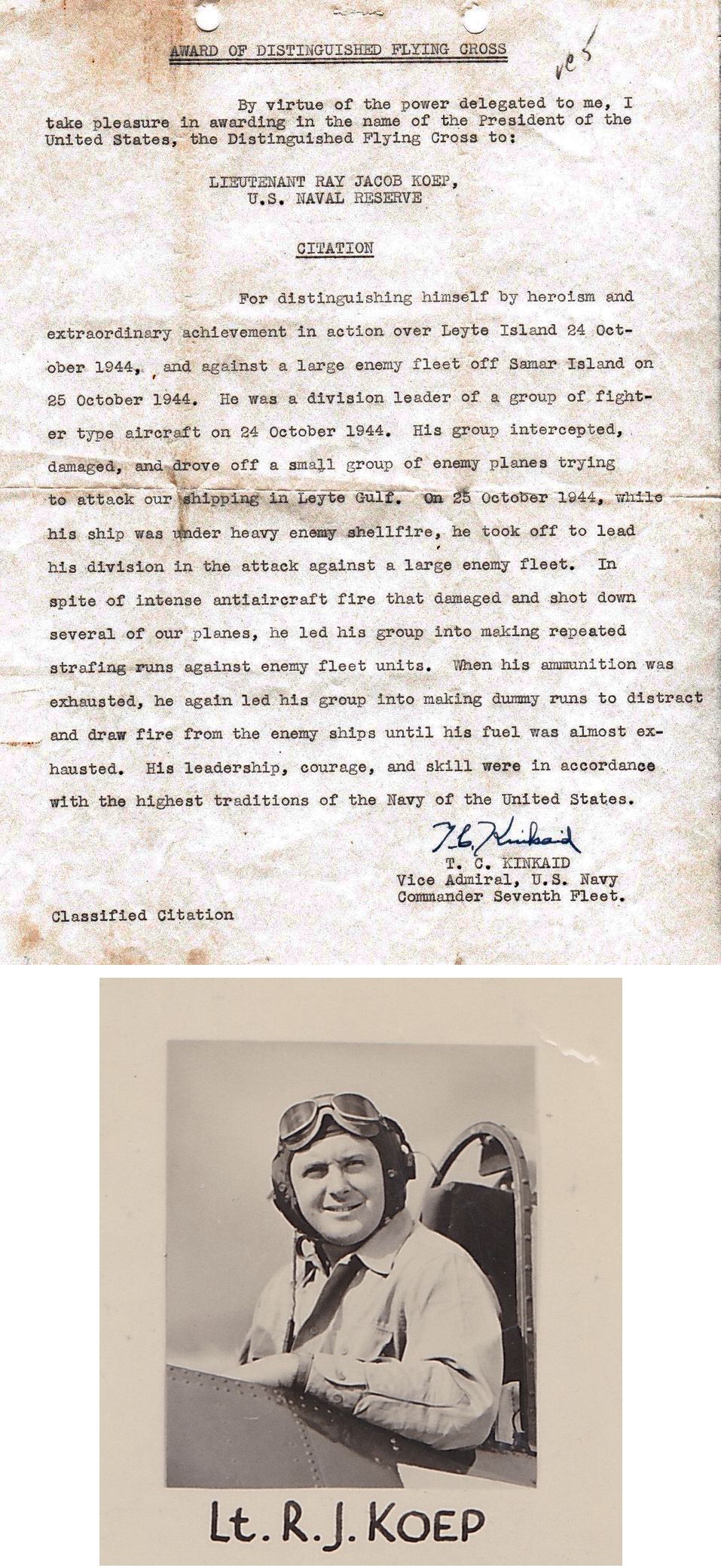 329k | LT Ray J. Koep, USNR, was awarded the Distinguished Flying Cross because of his "heroism and extraordinary achievement in action over Leyte Island 24 October 1944, and against a large enemy fleet off Samar Island on 25 October 1944." |