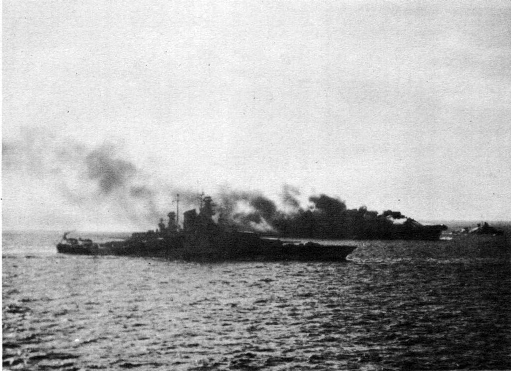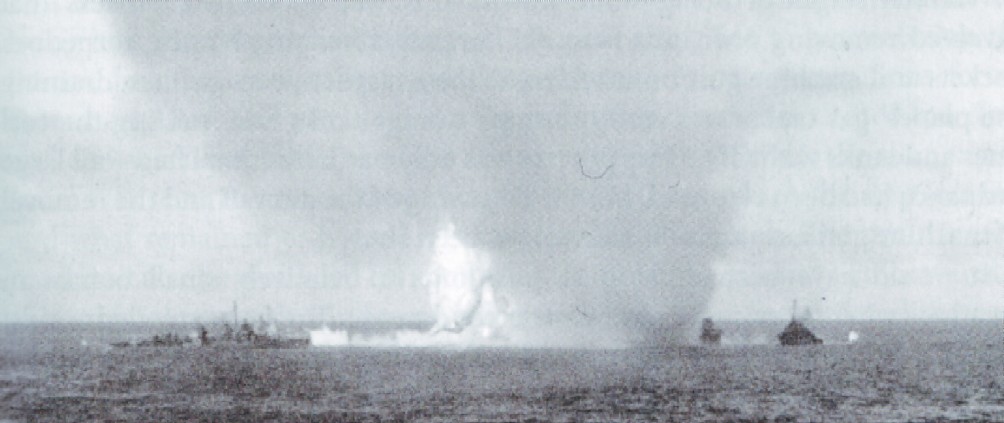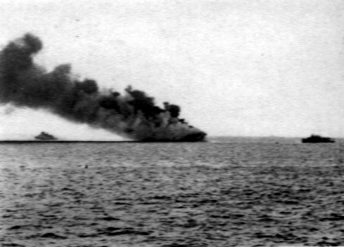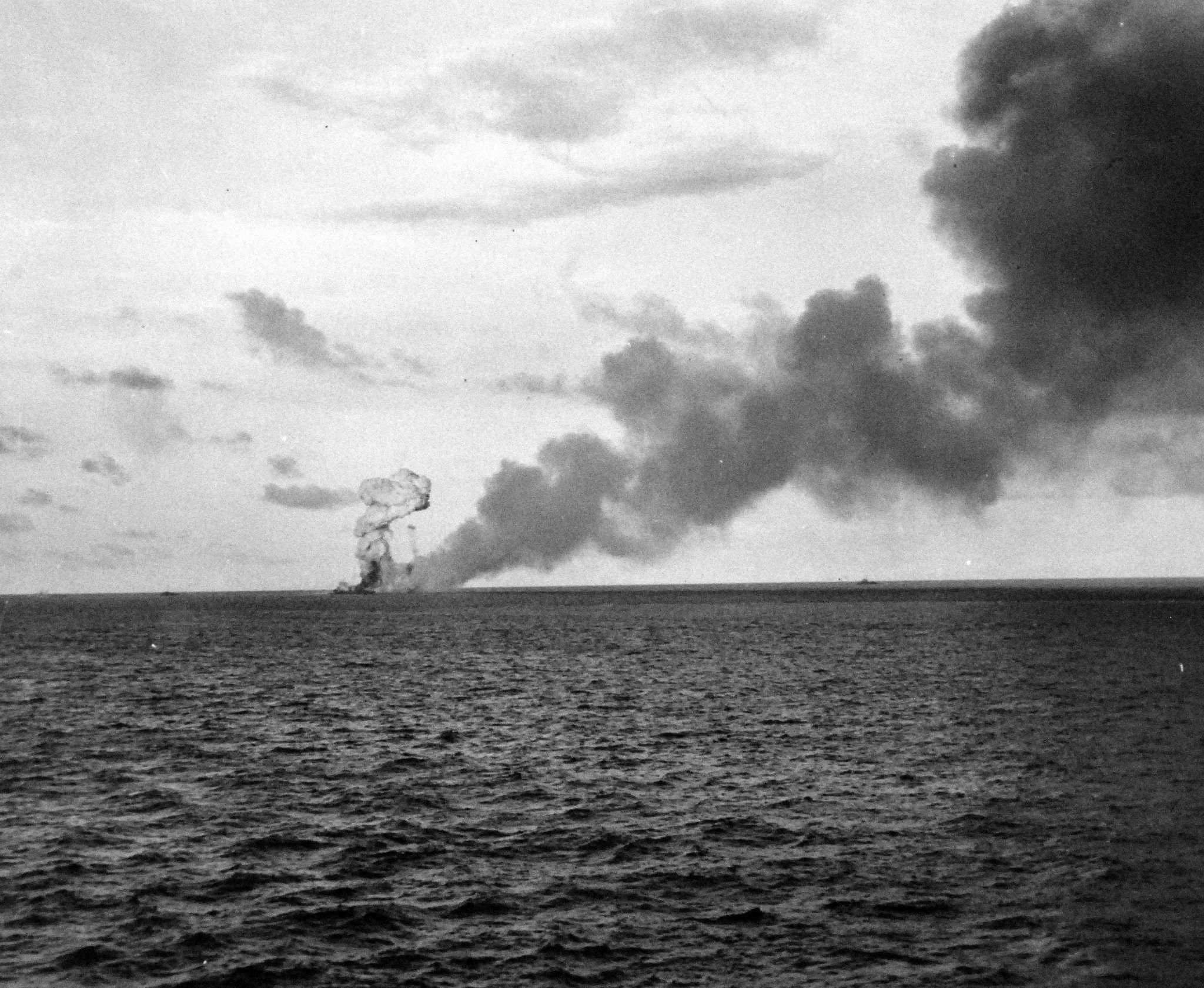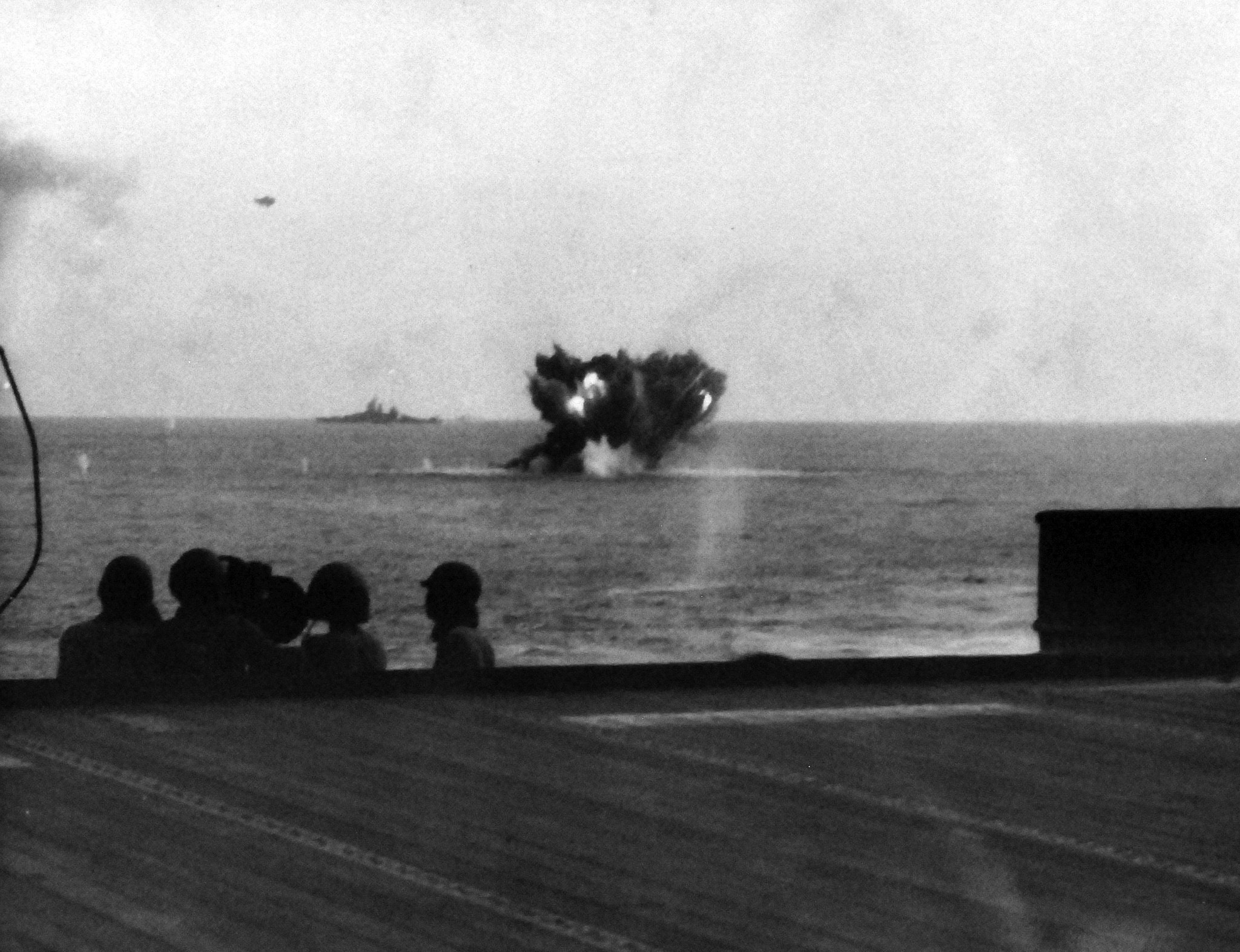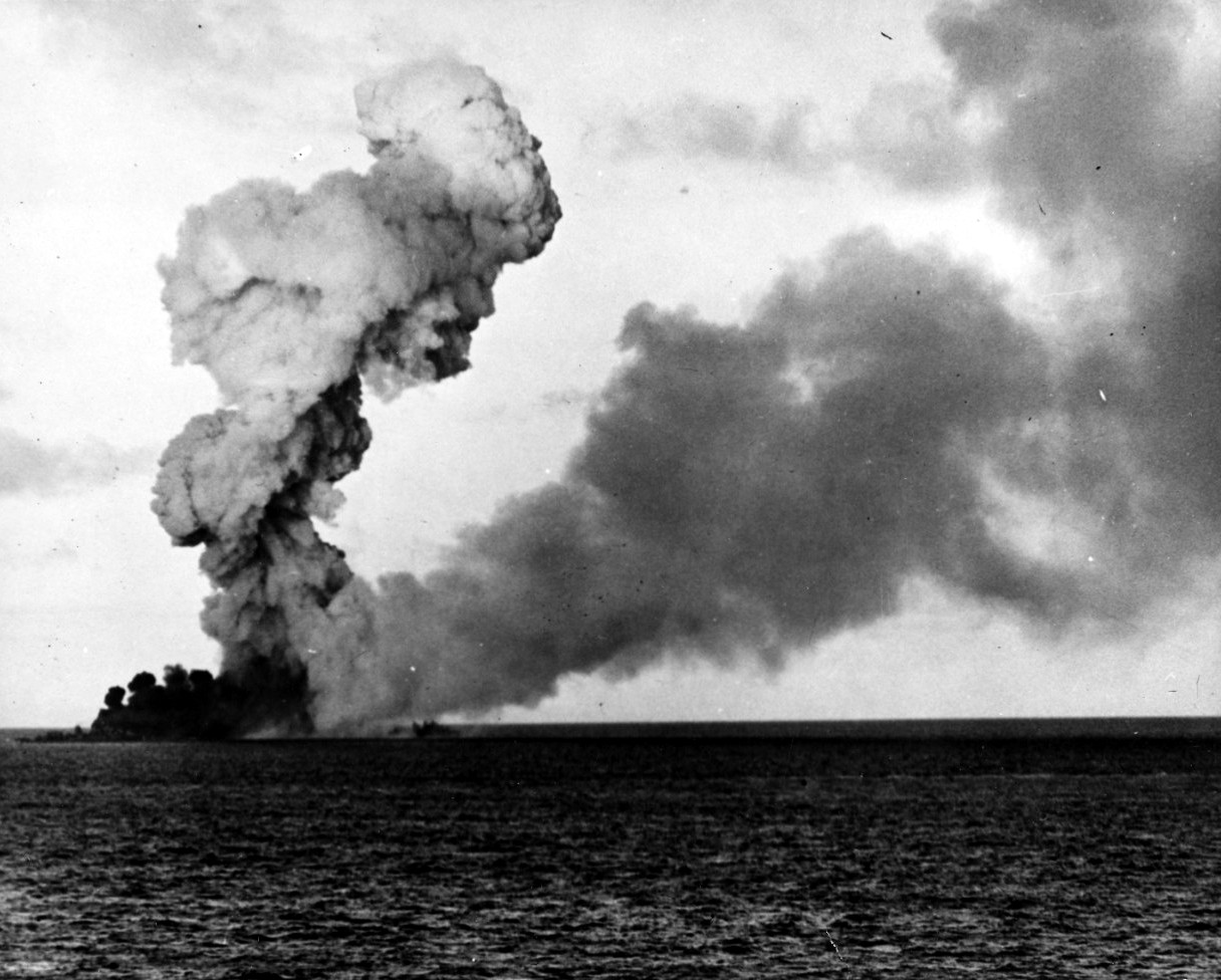 69k | [T]he explosion that doomed the carrier, the detonation of torpedo warheads stored aft, can be seen to the left of the mass of smoke that obscures all but her bow. Fortunately, the last of her crew had been taken off just minutes before. Photo National Archives and Records Administration. Photo and text from Fire From The Sky, by Robert C. Stern. |