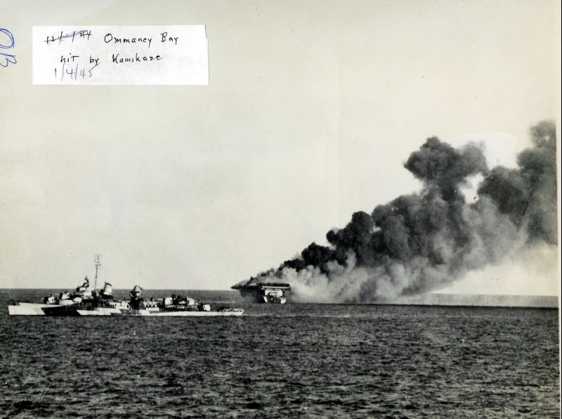 168k | USS Ommaney Bay (CVE-79), showing explosion on board after the ship was attacked by a kamikaze in the Sulu Sea, 4 January 1945. Destroyers are standing by. Courtesy of Donald M. McPherson, 1978. Naval History and Heritage Command, photo # NH 86336. |