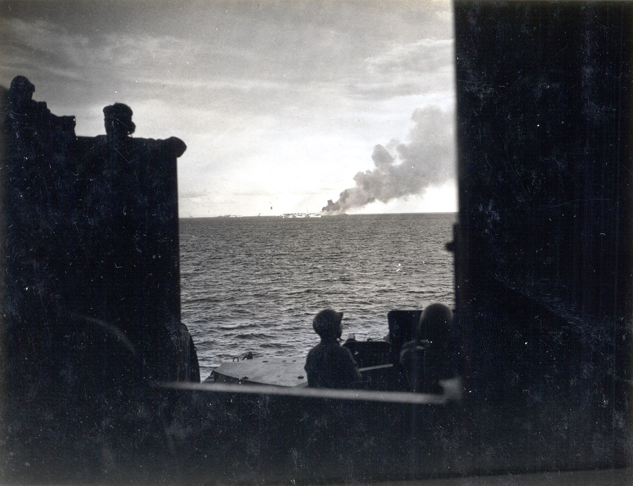 364k | Caption, written not long after the fact, reads "A CVE burning on the Sulu Sea.” Probably, USS Ommaney Bay (CVE-79) burning in the background, with (possibly) USS Wake Island (CVE-65) in the middle distance. |