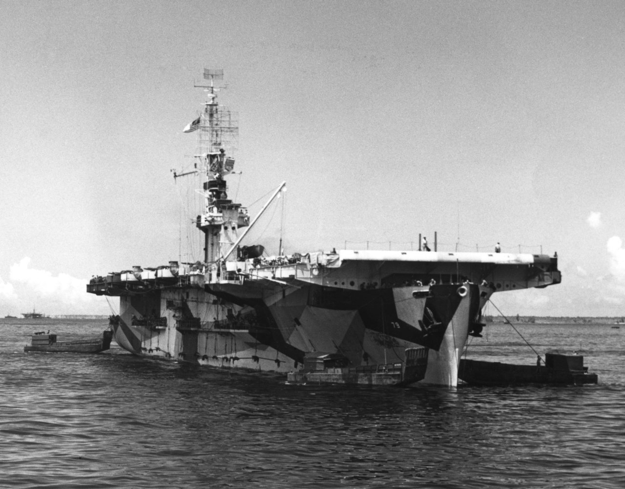 200k | USS Ommaney Bay (CVE-79) at Manus, Admiralty Islands, prior to entering floating drydock ABSD-2, 22 November 1944. Official U.S. Navy photograph, from the collections of the Naval History and Heritage Command (#NH 106820-A). This image is cropped from the original print for photo #NH 106820. |