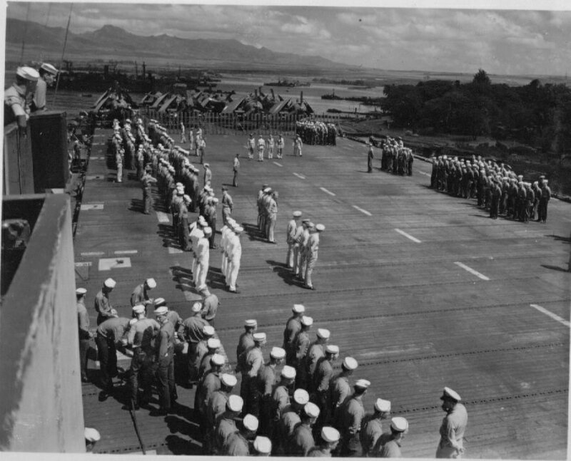 807k | At 0815, 3 February 1945, "Following Captain's inspection of the crew, Captain John G. Foster, Jr., U.S. Navy, relieved Captain Curtis S. Smiley, U.S. Navy, as commanding officer." |