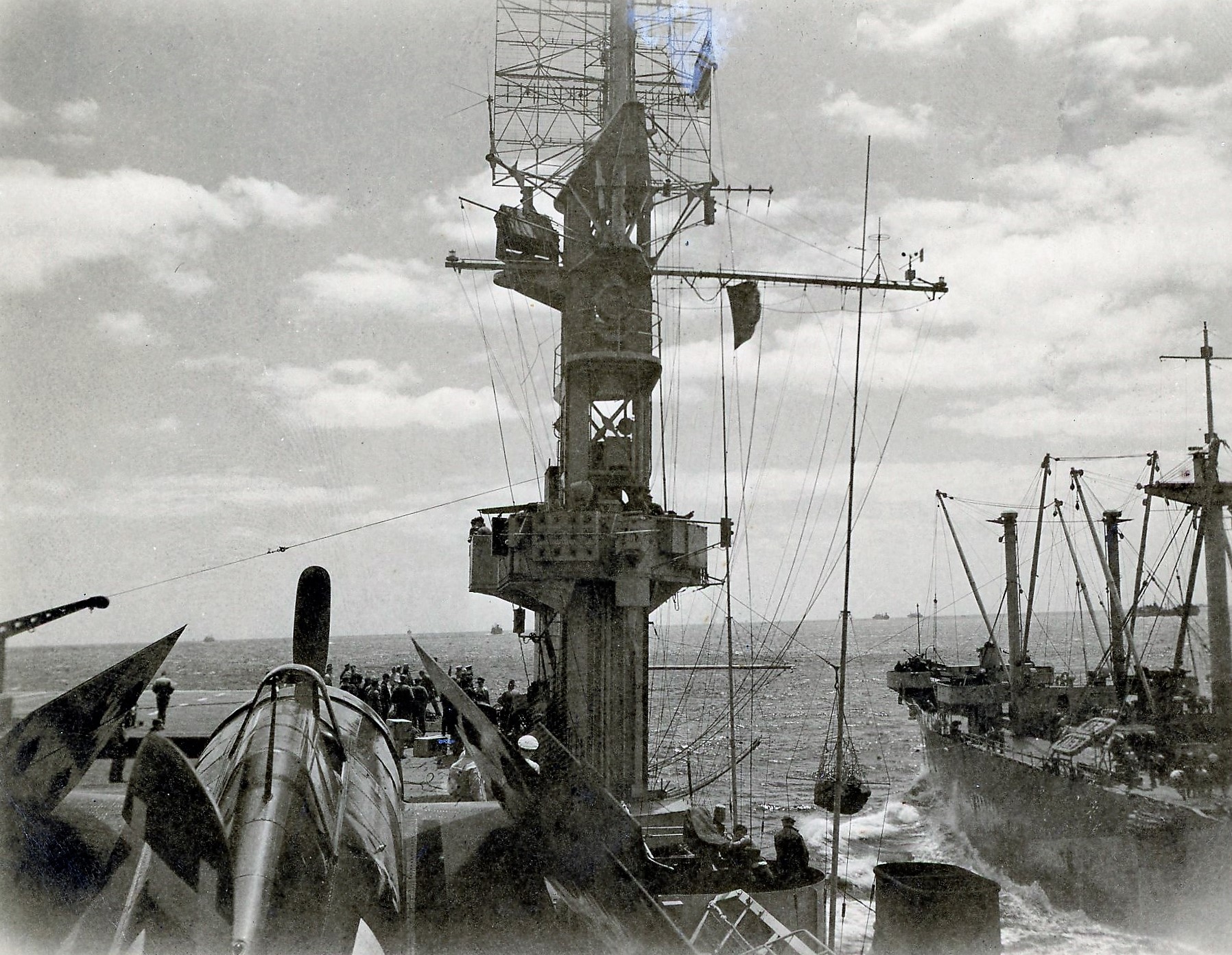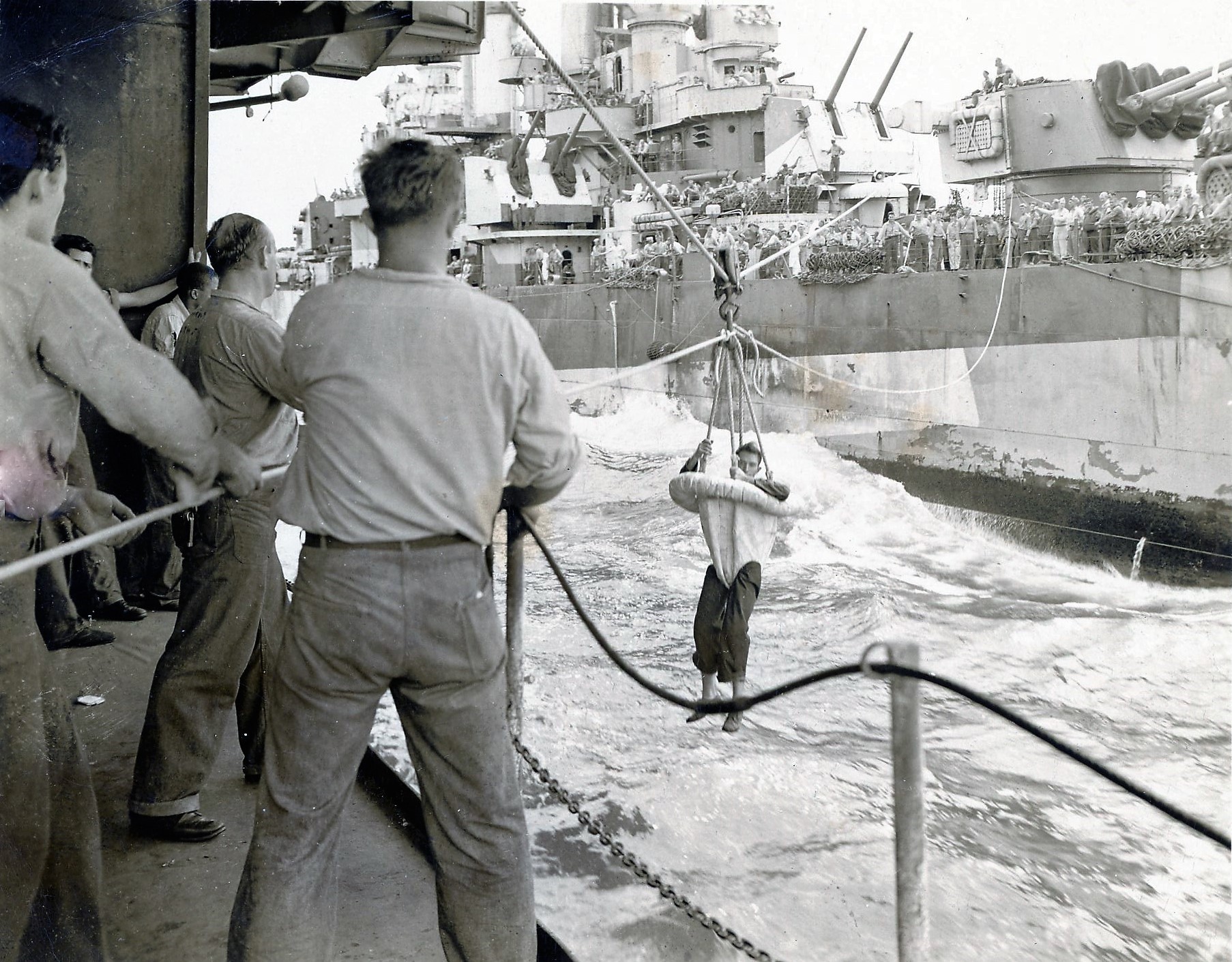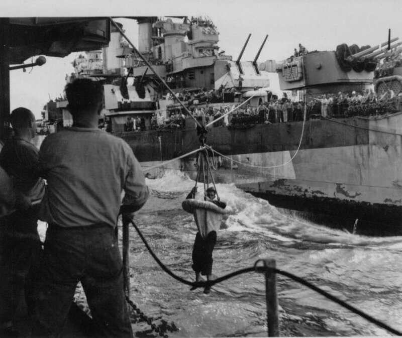 685k | "Pilot recovery from large cruiser, 1944." This may be 18 October 1944. From USS Rudyerd Bay's War Diary for the Month of October 1944: "At 1030 U.S.S. Birmingham (CL62) came alongside and transferred six (6) officers and one hundred twenty-seven (127) enlisted personnel from the U.S.S. Houston [(CL-81)] for transportation." Birmingham was camouflaged in Measure 33, Design 6D, which matches the photo. NS0308106 is the same photo, differently cropped. | C. Duane Earlywine | |||||||||||||