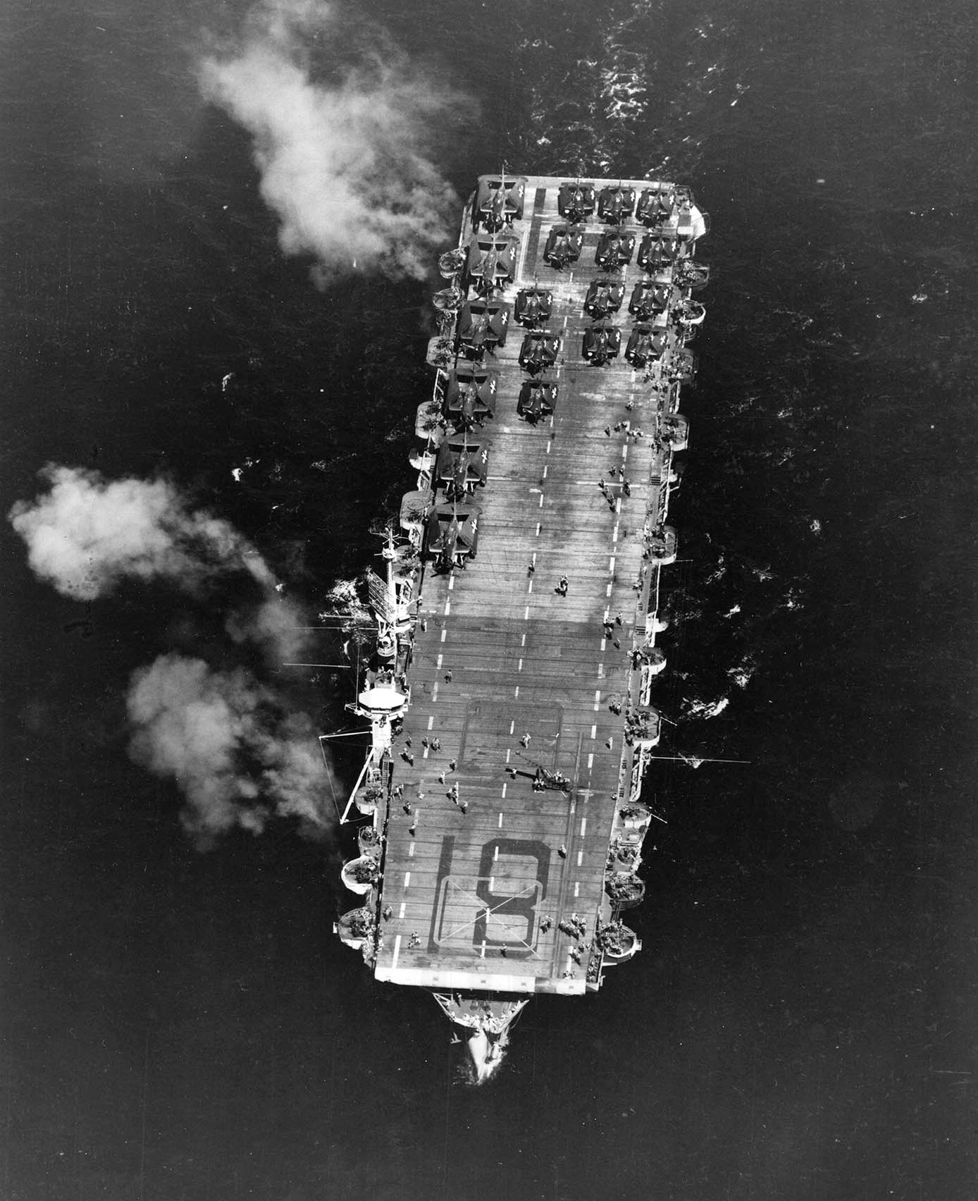 810k | Crewmen aboard USS Rudyerd Bay (CVE-81) watch as another CVE (USS Wake Island [CVE-65]?) is under attack, 1945. |