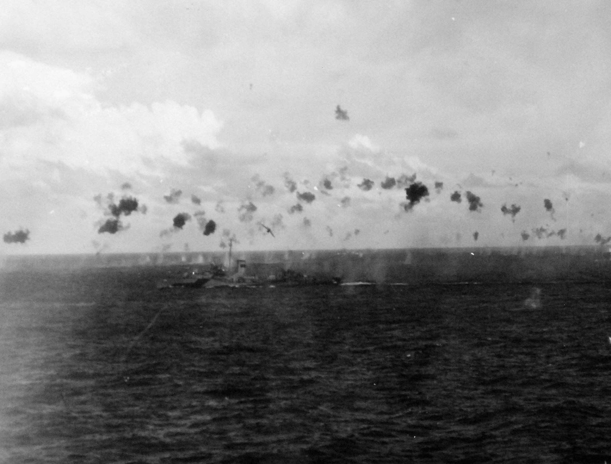 608k | Japanese plane making suicide attack on Task Force 77.4.2. Destroyer is probably USS Helm (DD-388), which was also hit by a kamikaze on this day. Photograph by USS Steamer Bay (CVE-87), released 5 January 1945. Official U.S. Navy photograph, now in the collections of the National Archives and Records Administration (NARA), # 80-G-273114. |