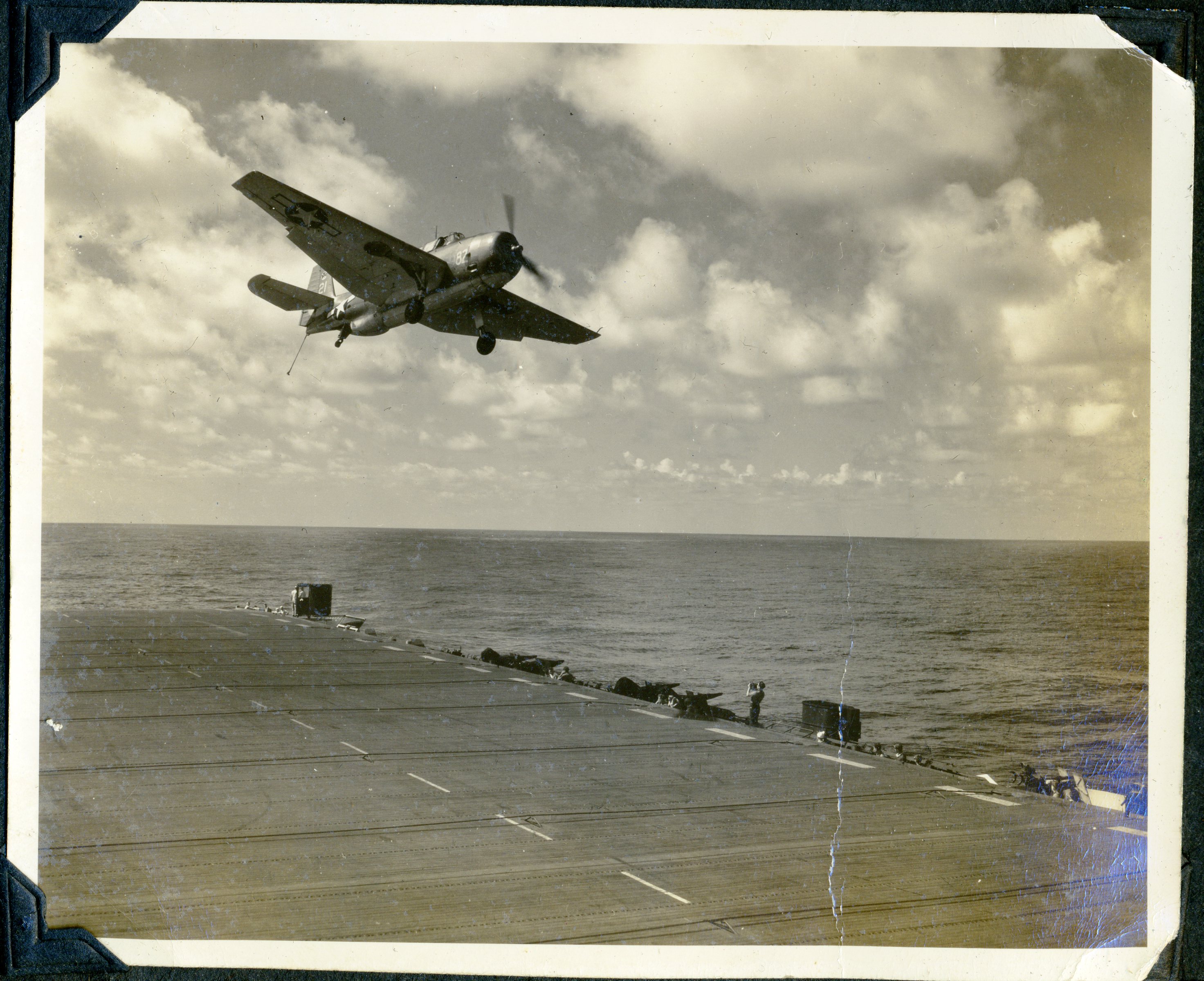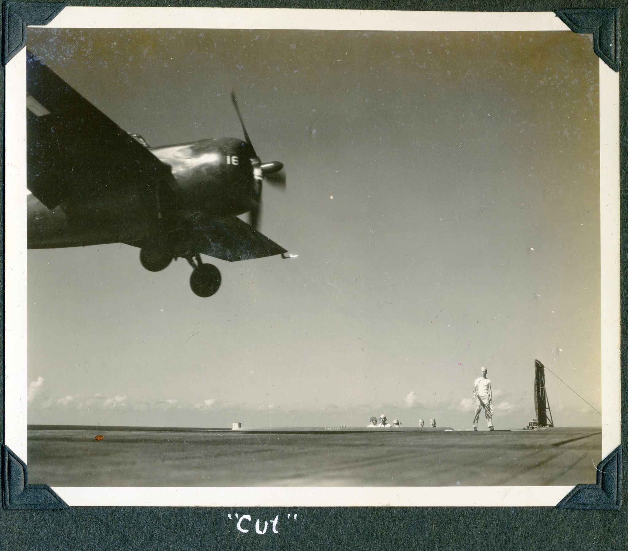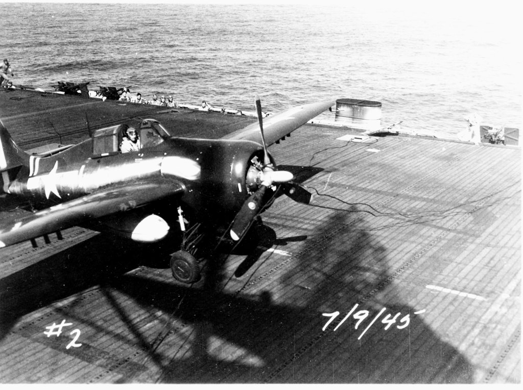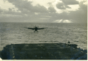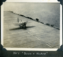 168k | An FM-2 Wildcat of VC-93 snags the arresting gear, July 9, 1945. Note three launch stubs for 5" High Velocity Air Rockets (HVARs) under each wing — these were fitted to late-production FM-2's. |