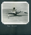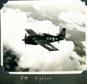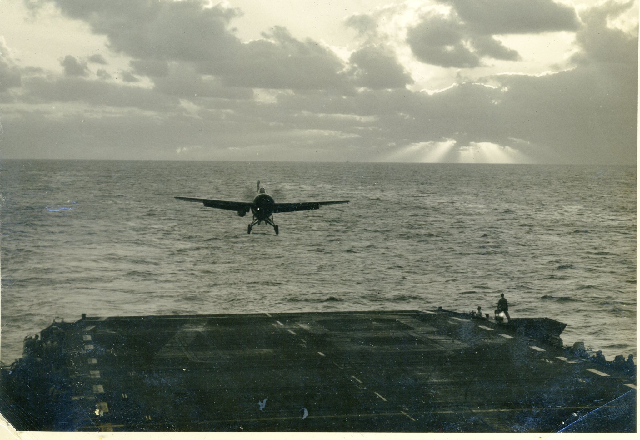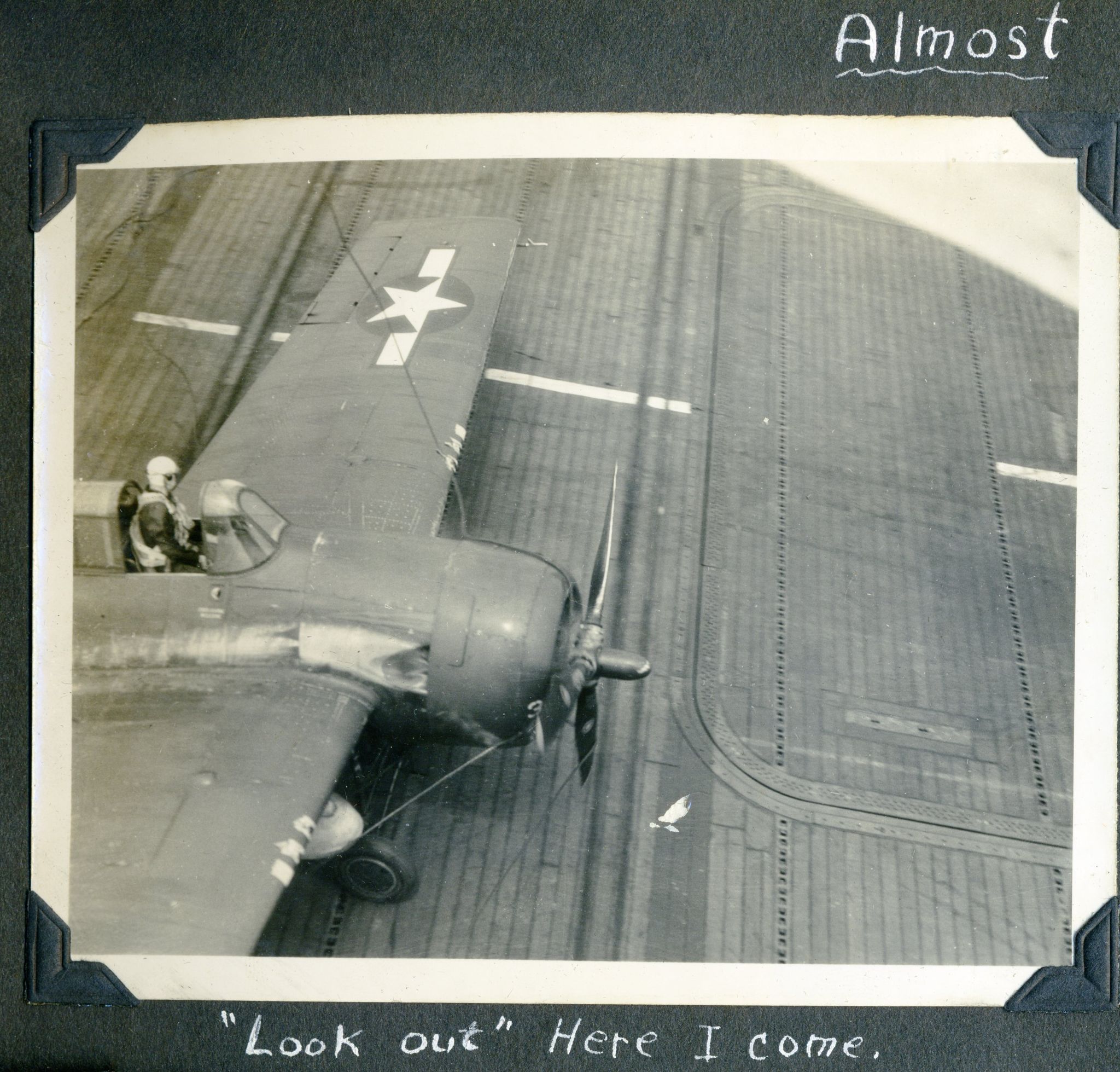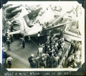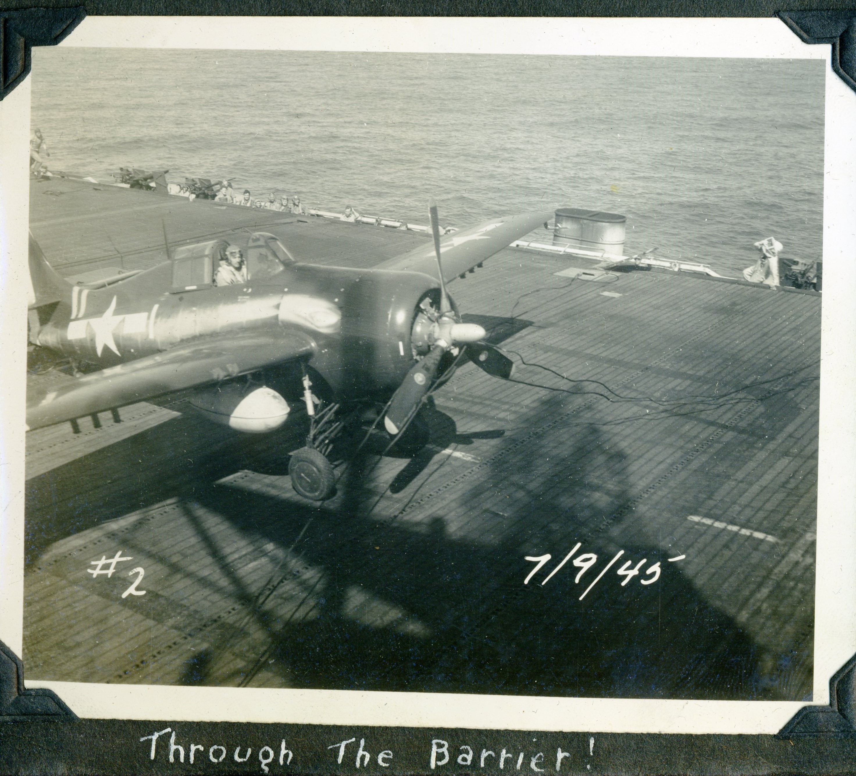 168k | An FM-2 Wildcat of VC-93 snags the arresting gear, July 9, 1945. Note three launch stubs for 5" High Velocity Air Rockets (HVARs) under each wing — these were fitted to late-production FM-2's. |