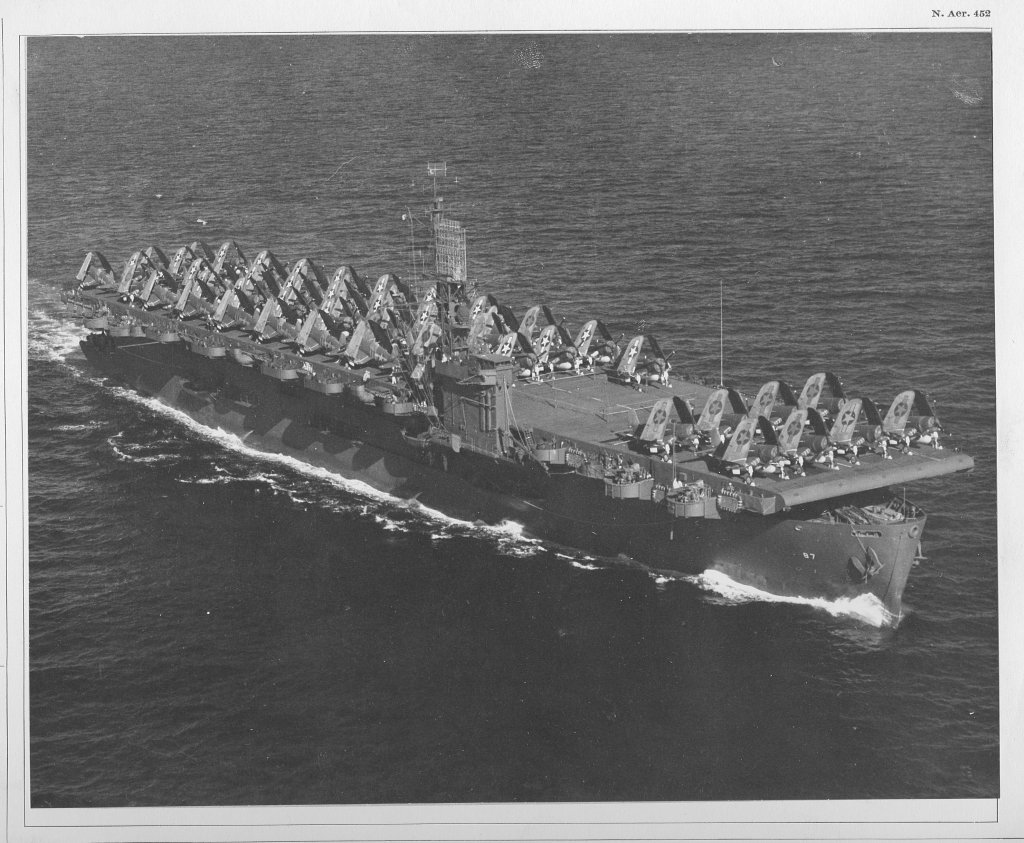 170k | A nice photo of USS Steamer Bay (CVE-87), taken from a ZP-31 airship on 14 May 1944, near the California coast, transporting lots of F4U Corsairs. |