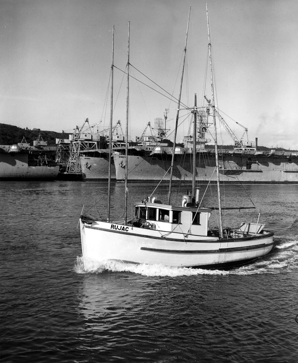 696k | The salmon trawler Rujac underway off Tacoma, Washington, 18 June 1947, with decommissioned Navy escort carriers moored in the background: Stern of ex-USS Hollandia (CVE-97), along with ex-USS Steamer Bay (CVE-87) moored outboard of ex-USS Lunga Point (CVE-94), all three ships part of the Tacoma Group, Pacific Reserve Fleet. Source: Tacoma Public Library, Richards Studio, Photo No. D28441-4. |