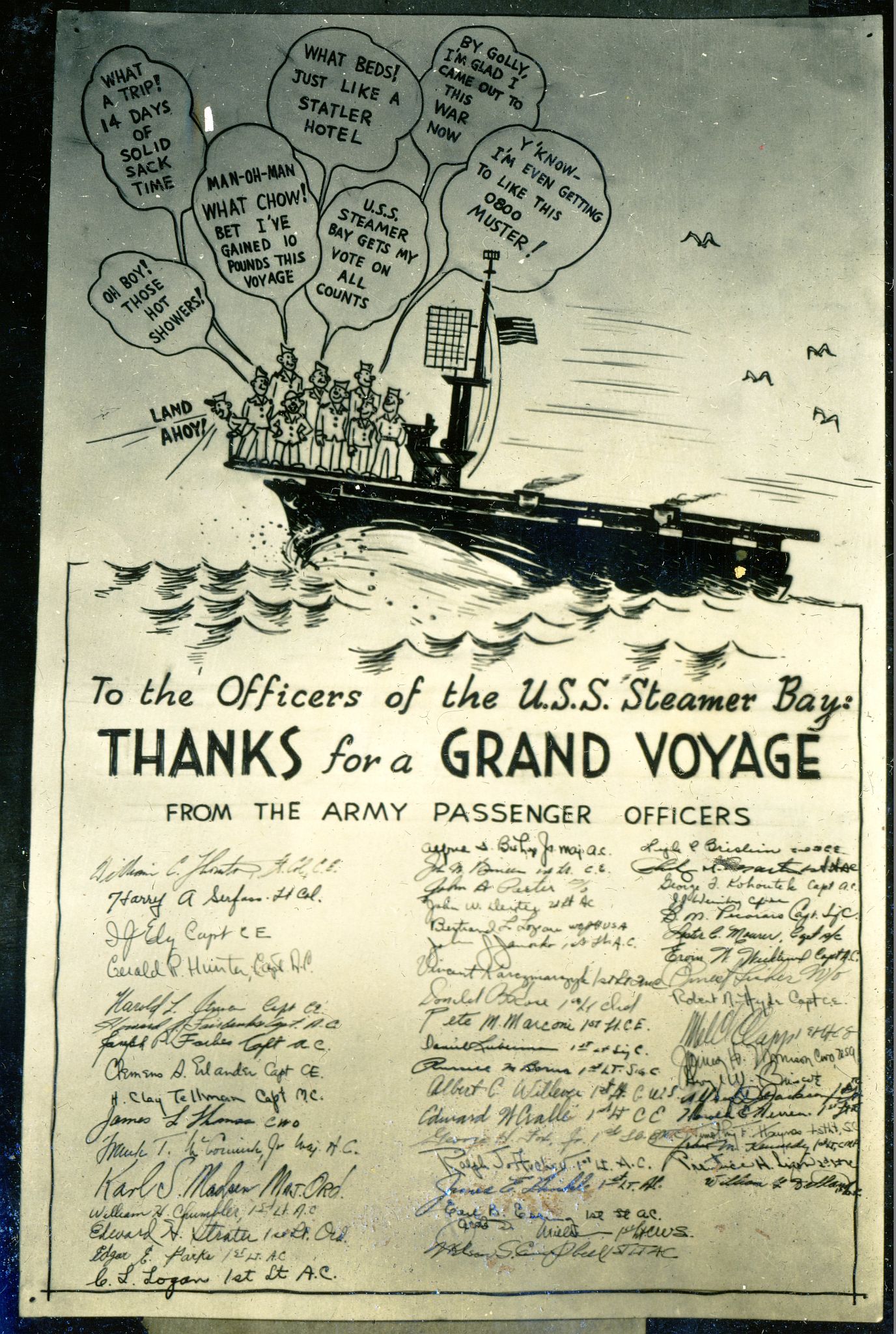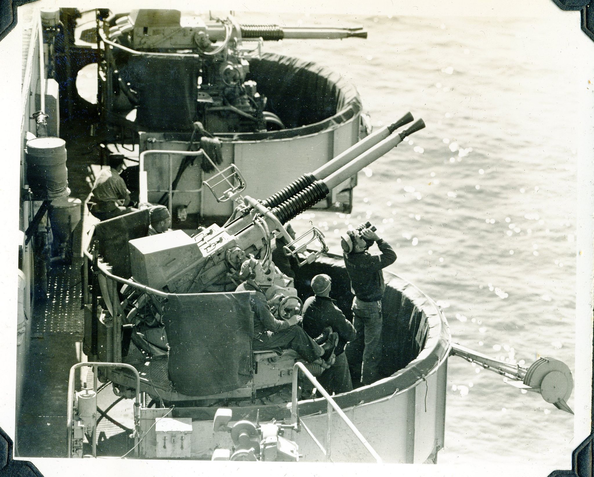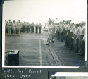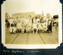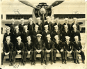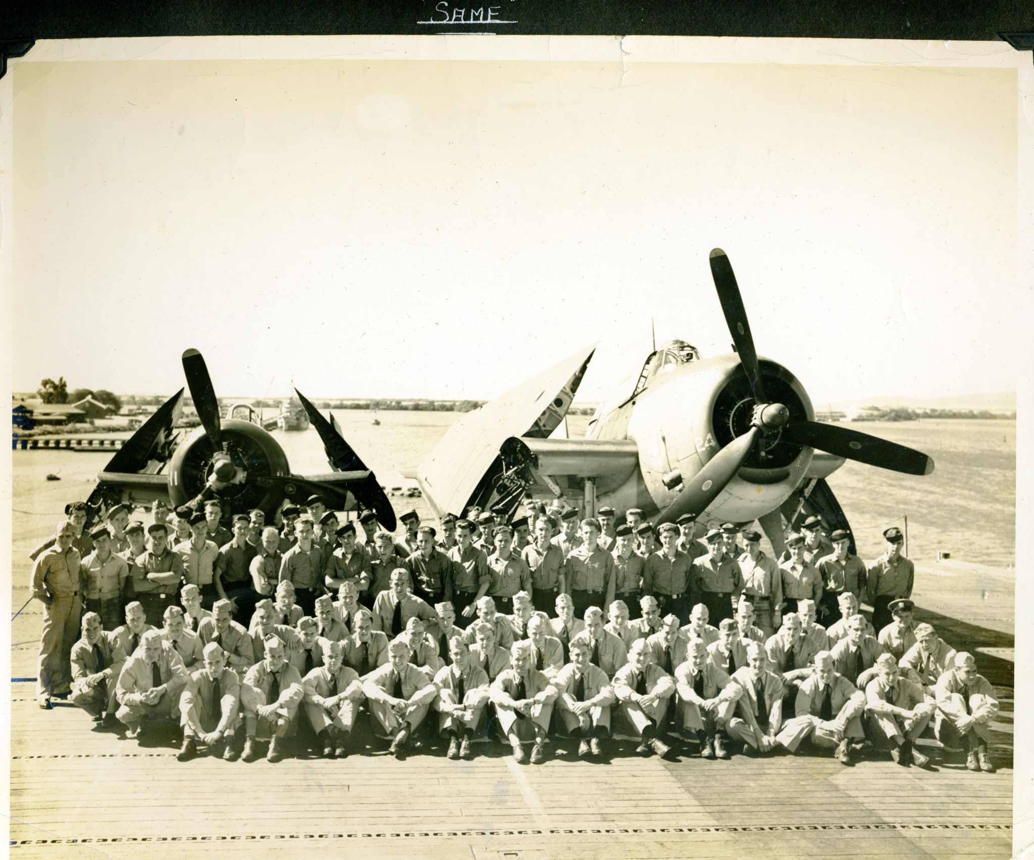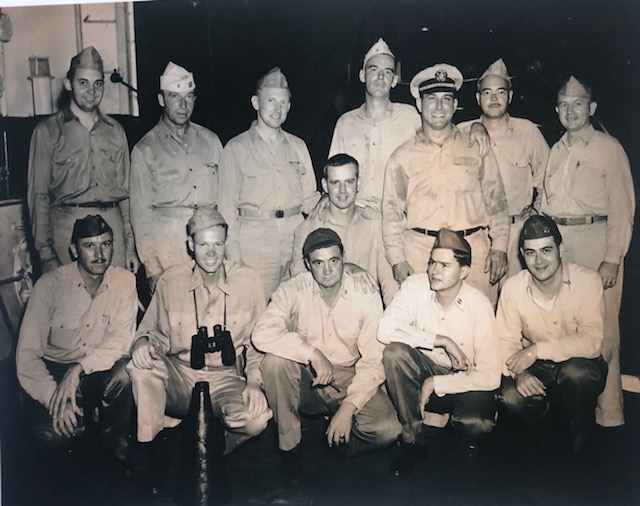 91k | Crew of USS Steamer Bay (CVE-87). LT(JG) Jack Newlin is second from left, with binoculars, in the first row. |
