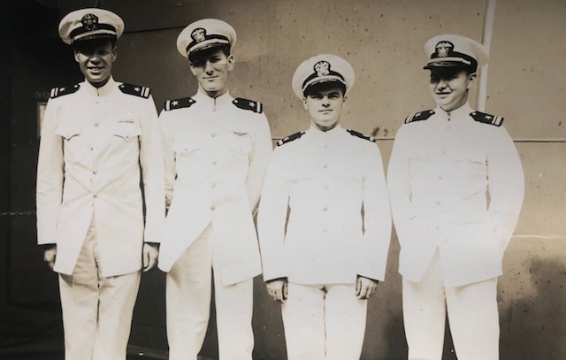 54k | Left to right: LT(JG) Newlin, ENS Foote, ENS McDermott, and LT(JG) Harter. Photo is dated 9 August 1944. |