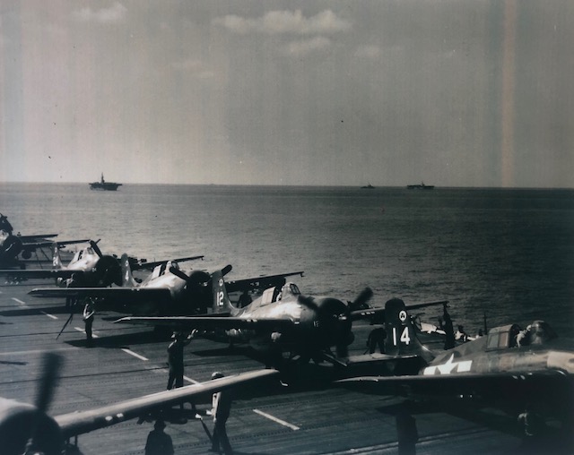 91k | USS Steamer Bay (CVE-87) with two Avenger torpedo bombers, and two Wildcat fighters on deck. Date and location unknown. U.S. Navy photo. |