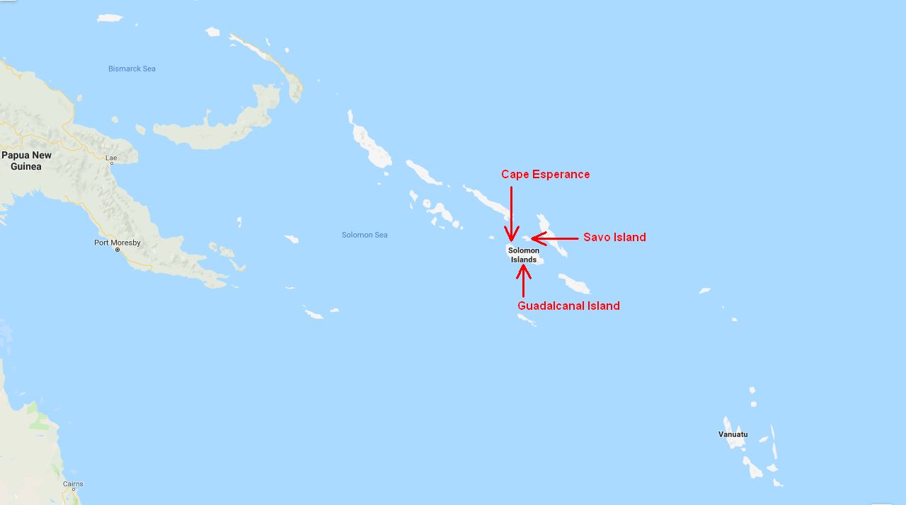 68k | CVE-88 was initially named Tananek Bay, a misspelling of Tonowek Bay, for a bay located in Alaskan waters, north of the Gulf of Esquibel between Prince of Wales Island and Hecata Island (NS0308814). Renamed, 6 November 1943, after the battle fought off Cape Esperance, Guadalcanal, at midnight on 11–12 October 1942. An American Task Force commanded by RADM Norman Scott defeated a Japanese force under Rear Admiral Goto Aritomo, which was attempting to bombard Henderson Field, Guadalcanal (NS0308814a). NS0308814b: US Navy track chart of the battle, 1943. It accurately depicts the movement of US ships (lower tracks), but not of the Japanese ships (upper, darker line), as it was drawn during the war, when only incomplete information was available. US ships: heavy cruisers San Francisco (CA-38, flag) and Salt Lake City (CA-25); light cruisers Boise (CL-48, severely damaged) and Helena (CL-50); destroyers Laffey (DD-459), Buchanan (DD-484), Duncan (DD-485, sunk), McCalla (DD-488), and Farenholt (DD-491, damaged). Japanese ships: heavy cruisers Aoba (flag, heavily damaged), Furutaka (sunk), and Kinugasa; destroyers Fubuki (sunk), and Hatsuyuki. (Maps NS0308814 and NS0308814a courtesy of Google Maps.) |
