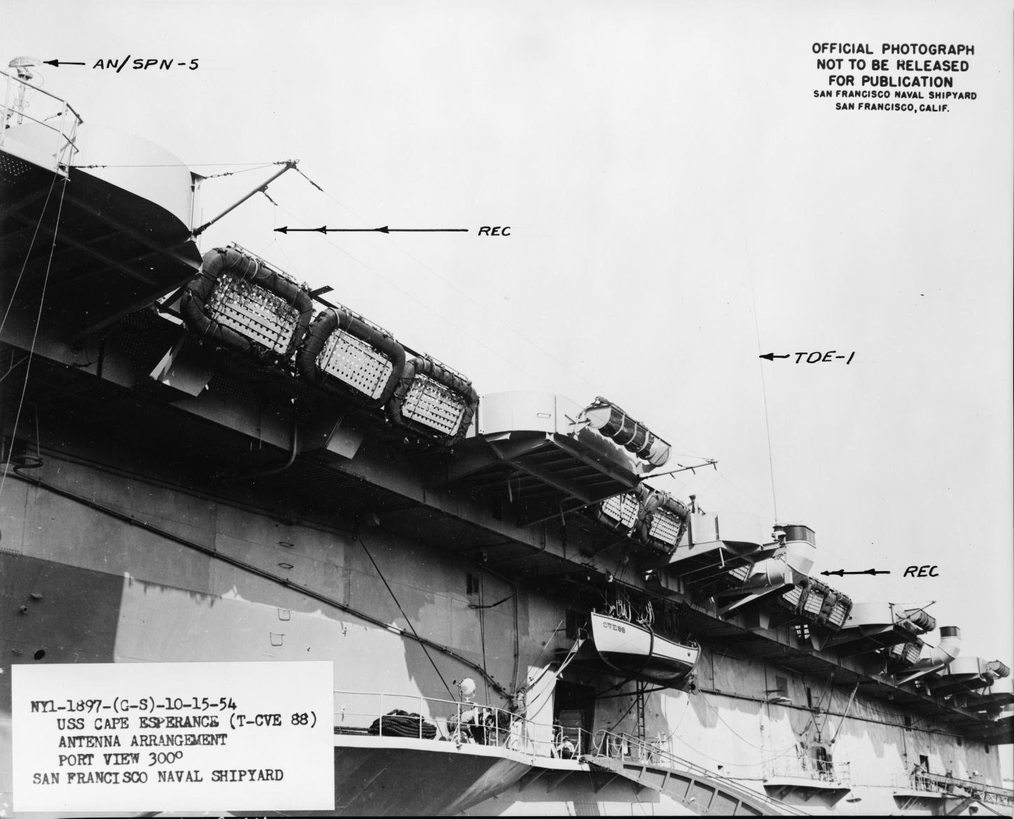 174k | USS Cape Esperance (T-CVE 88), antenna arrangement, port view 300°, San Francisco Naval Shipyard, NY1-1897-(G-S)-10-15-54. 15 October 1954. National Archives and Records Administration (NARA), # rg19nn-b1584-005-001. |