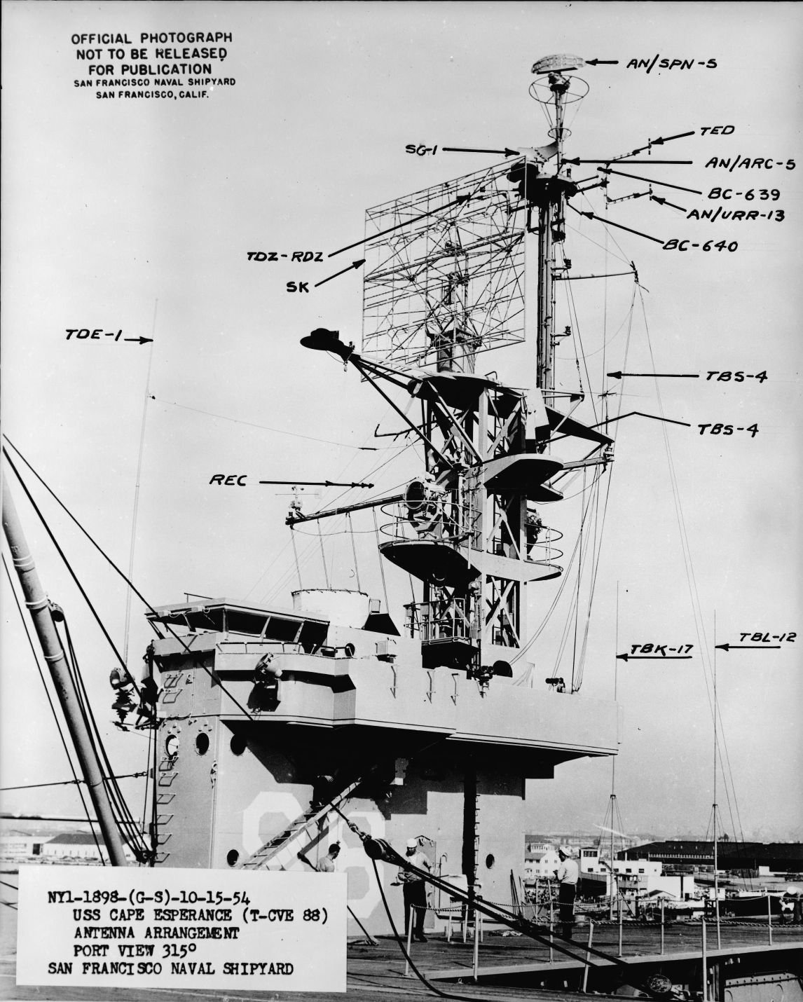 265k | USS Cape Esperance (T-CVE 88), antenna arrangement, port view 315°, San Francisco Naval Shipyard, NY1-1898-(G-S)-10-15-54. 15 October 1954. National Archives and Records Administration (NARA), # rg19nn-b1584-005-002. |