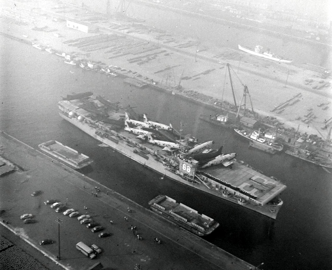 187k | USNS Cape Esperance (T-CVU 88) at Pearl Harbor, Hawaii, with a cargo of Navy and Air Force aircraft during the mid-1950s. Aircraft visible on her flight deck include AD Skyraider attack planes, F2H Banshee fighters and at least one U.S. Air Force F-100 Super Sabre. Official U.S. Navy Photograph, from the collections of the Naval History and Heritage Command (# NH 52441). |