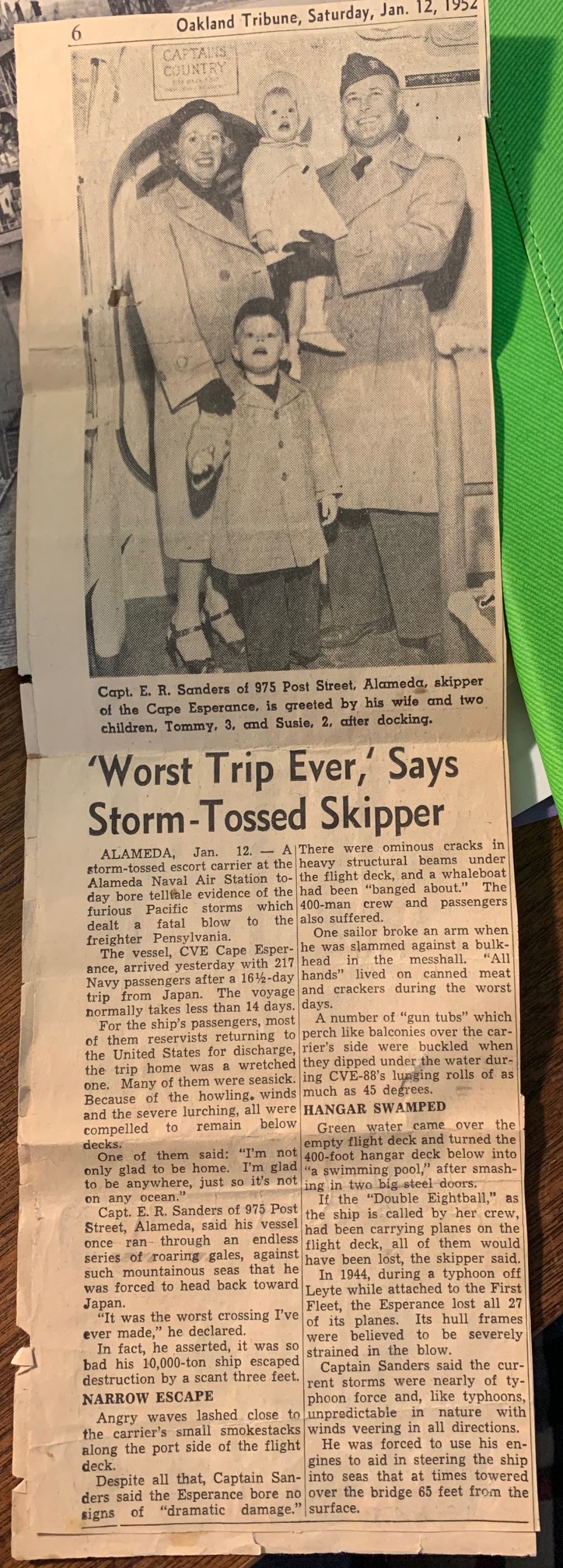 598k | "'Worst Trip Ever,' Says Storm-Tossed Skipper" Oakland Tribune, Saturday, 12 January 1952. |