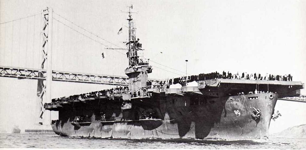 90k | USS Thetis Bay (CVE-90) in San Francisco Bay, 12 December 1945, completing a Magic Carpet trip from the Pacific Theater. Anti-aircraft guns are covered with canvas. The ship is painted in Measure 21 camouflage. |
