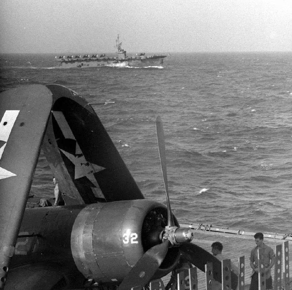 306k | "These are scenes shot by George Silk, , aboard USS Thetis Bay (CVE-90) while returning from an aircraft re-supply relay to forward forces off mainland Japan, 1 or 2 August 1945, TF38." "The jeeps in the distance are USS Kitkun Bay (CVE-71) and USS Nehenta Bay (CVE-74) but I did not find enough formation log detail to specifically say which is which." Used for educational and non-commercial purpose. |