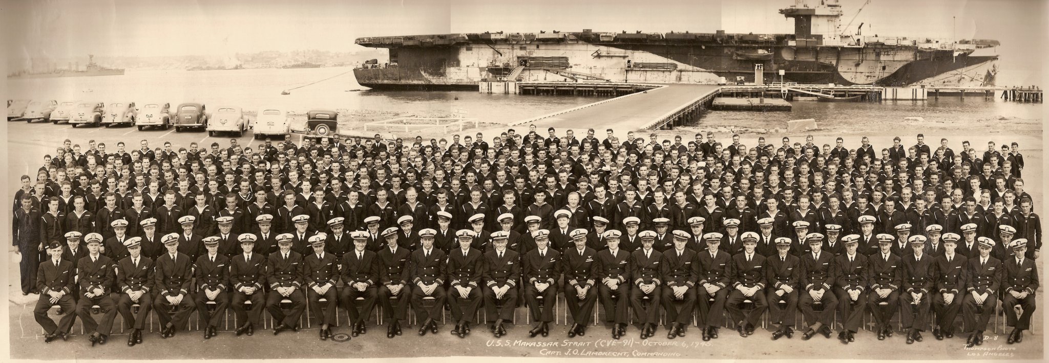 391k | Crew of USS Makassar Strait (CVE-91), 6 October 1945. CO was CAPT John O. Lambrecht. Note the ship was painted in camouflage Measure 32, Design 16A (thanks to Aryeh Wetherhorn.) |