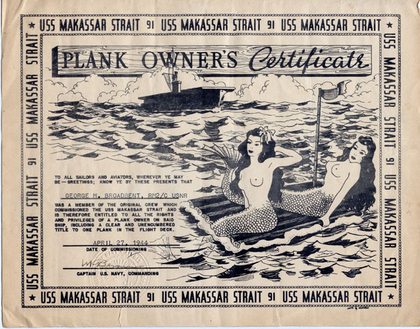137k | Plank Owner's Certificate. | George Broadbent Jr., son of George Broadbent, USS Makassar Strait, 1944 |