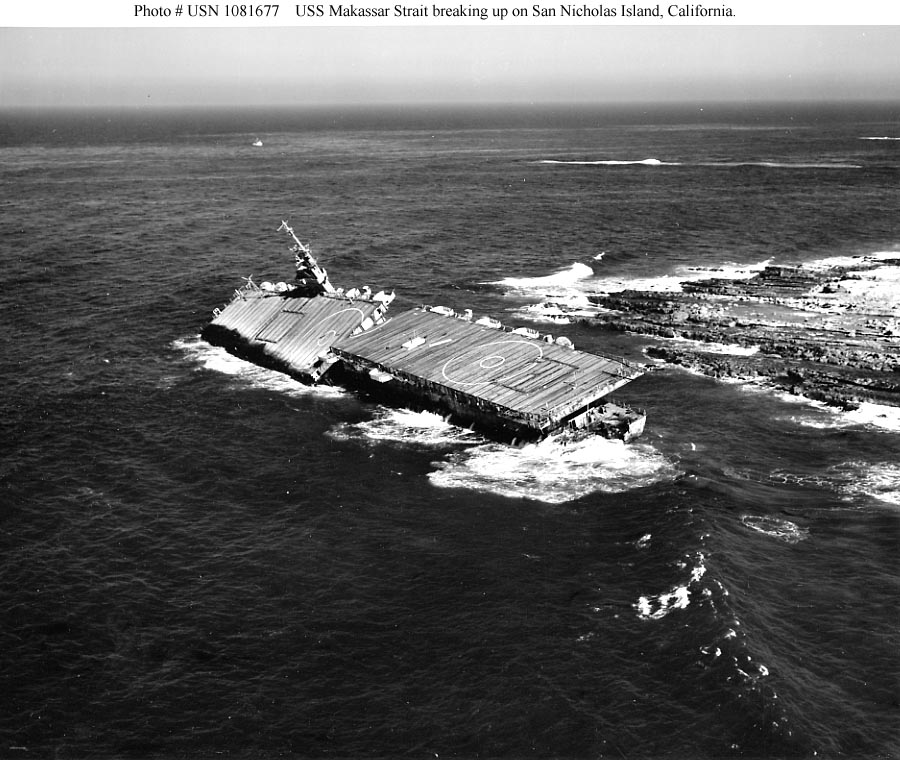 136k | Ex-USS Makassar Strait (CVU-91) breaking up on San Nicholas Island, California, where she had gone ashore while used as a Pacific Missile Range target ship. Photographed on 22 January 1963. Official U.S. Navy photograph (#USN 1081677). |