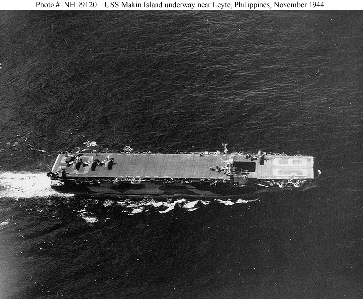 125k | USS Makin Island (CVE-93) underway in the southwestern Pacific, near Leyte, Philippine Islands, 18 November 1944. The ship is wearing Camouflage Measure 32, Design 16A. Collection of Rear Admiral Calvin T. Durgin, USN, donated by his Daughter, Mrs. Phyllis Sherrill, 1972. Official U.S. Navy Photograph, from the collections of the Naval Historical Center (# NH 99120). |