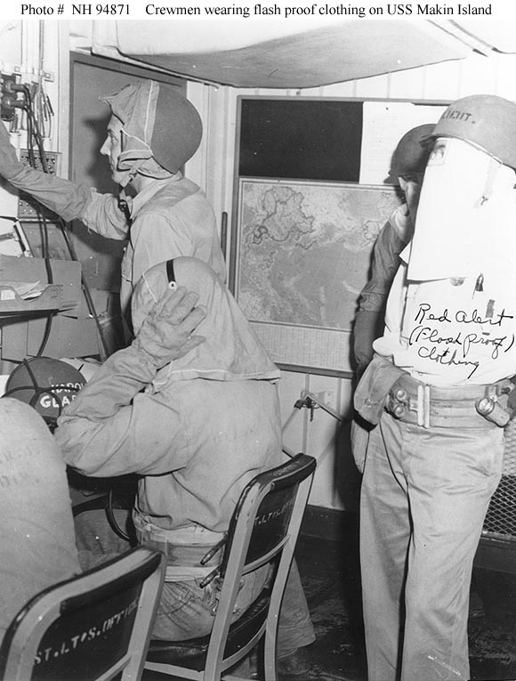 87k | Crewmen at their battle stations, wearing flash proof clothing and inflatable life belts, circa 1944-1945. Courtesy of PHC John Highfill, USN (Retired). U.S. Naval Historical Center Photograph (# NH 94871). |